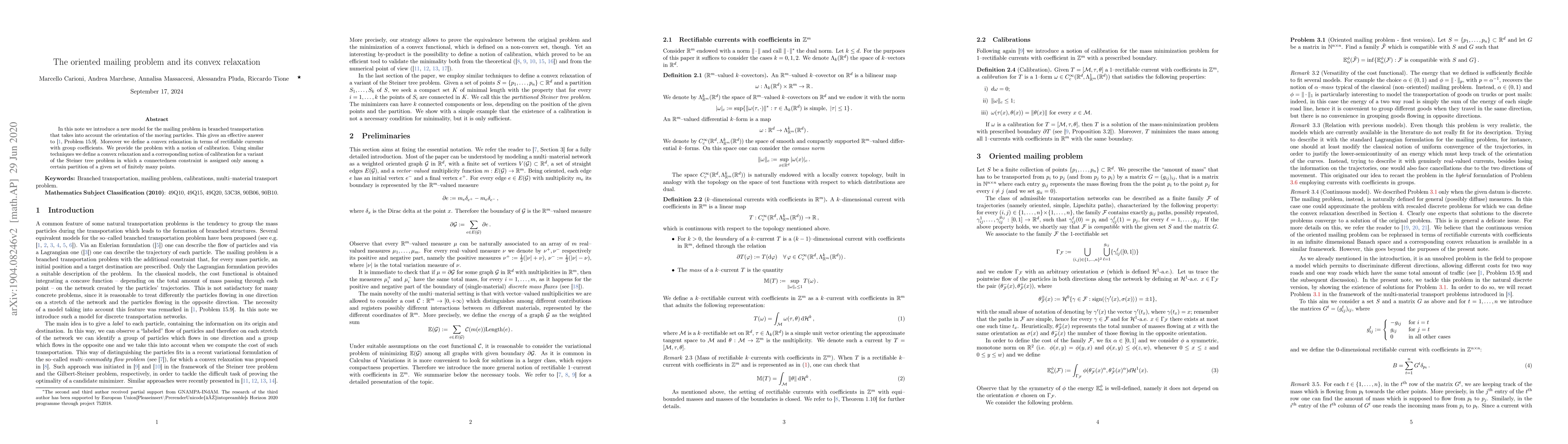 In this note we introduce a new model for the mailing problem in branched transportation in order to allow the cost functional to take into account the orientation of the moving particles. This gives an effective answer to [Problem 15.9] of the book "Optimal transportation networks" by Bernot, Caselles, and Morel. Moreover we define a convex relaxation in terms of rectifiable currents with group coefficients. With such approach we provide the problem with a notion of calibration. Using similar techniques we define a convex relaxation and a corresponding notion of calibration for a variant of the Steiner tree problem in which a connectedness constraint is assigned only among a certain partition of a given set of finitely many points.