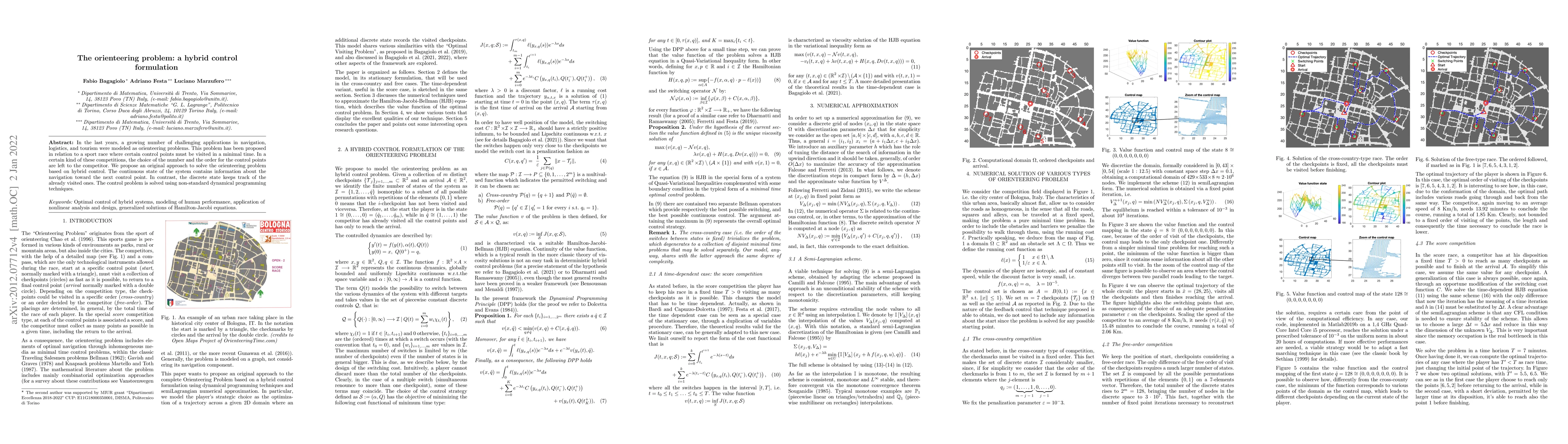 In the last years, a growing number of challenging applications in navigation, logistics, and tourism were modeled as orienteering problems. This problem has been proposed in relation to a sport race where certain control points must be visited in a minimal time. In a certain kind of these competitions, the choice of the number and the order for the control points are left to the competitor. We propose an original approach to solve the orienteering problem based on hybrid control. The continuous state of the system contains information about the navigation toward the next control point. In contrast, the discrete state keeps track of the already visited ones. The control problem is solved using non-standard dynamical programming techniques.