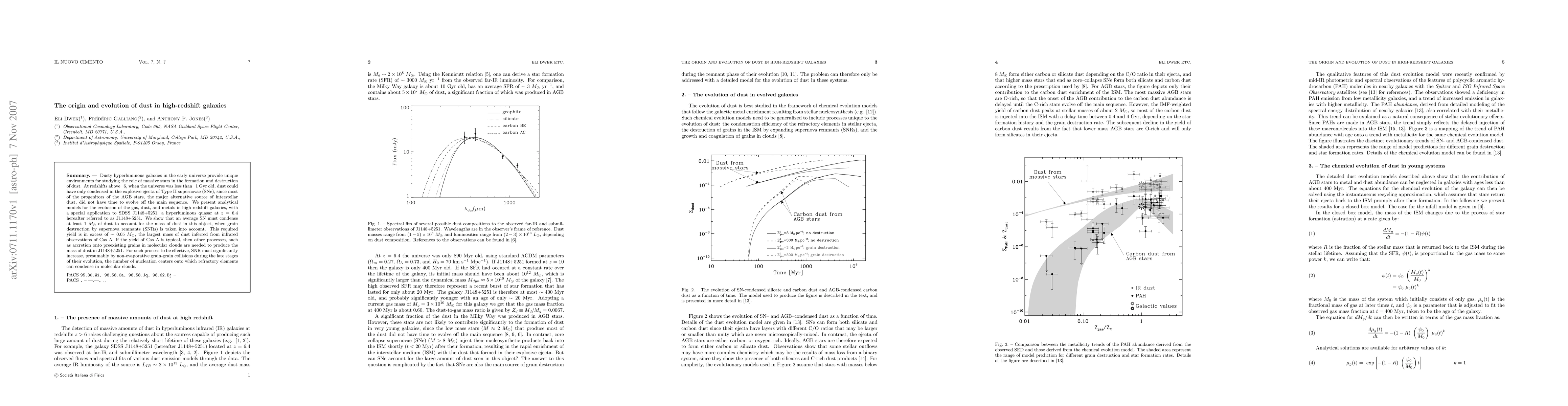 This paper investigates the formation and evolution of dust in high-redshift galaxies, focusing on the role of Type II supernovae in producing dust in the early universe. The study models the gas, dust, and metals in galaxies like SDSS J1148+5251, concluding that additional processes beyond typical supernova yields are necessary to account for the observed dust mass.