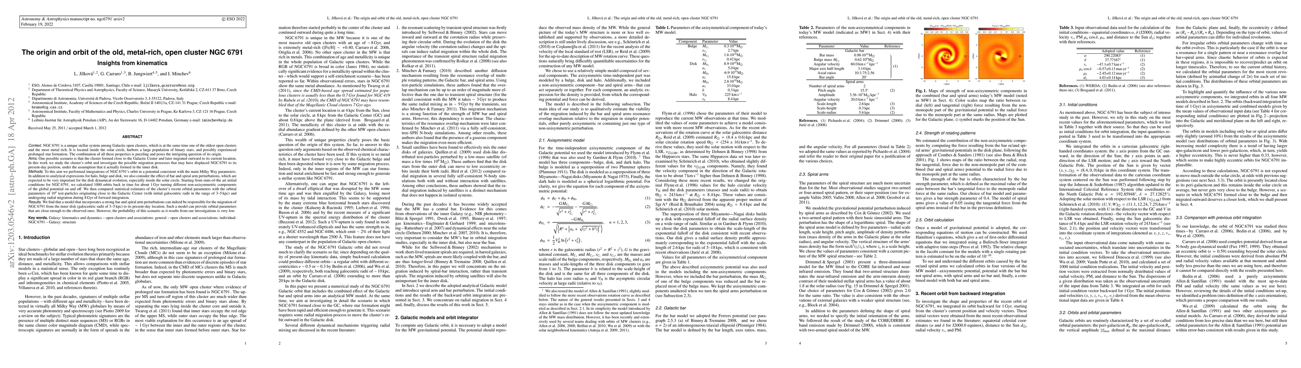 NGC 6791 is a unique stellar system among Galactic open clusters being at the same time one of the oldest open clusters and the most metal rich. Combination of its properties is puzzling and poses question of its origin. One possible scenario is that the cluster formed close to the Galactic Center and later migrated outwards to its current location. In this work we study the cluster's orbit and investigate the possible migration processes which might have displaced NGC 6791 to its present-day position, under the assumption that it actually formed in the inner disk. To this aim we performed integrations of NGC 6791's orbit in a potential consistent with the main Milky Way parameters. In addition to analytical expressions for halo, bulge and disk, we also consider the effect of bar and spiral arm perturbations, which are expected to be very important for the disk dynamical evolution, especially inside the solar circle. Starting from state-of-the art initial conditions for NGC 6791, we calculate 1000 orbits back in time for about 1 Gyr turning on and off different non-axisymmetric components of the global potential. We then compare statistical estimates of the cluster's recent orbital parameters with the orbital parameters of 10^4 test-particles originating close to the Galactic Center (having initial galocentric radii in the range of 3-5 kpc) and undergoing radial migration during 8 Gyr of forward integration. We find that a model which incorporates a strong bar and spiral arm perturbations can indeed be responsible for the migration of NGC 6791 from the inner disk (galocentric radii of 3-5 kpc) to its present-day location. Such a model can provide orbital parameters which are close enough to the observed ones. However, the probability of this scenario as it results from our investigations is very low.