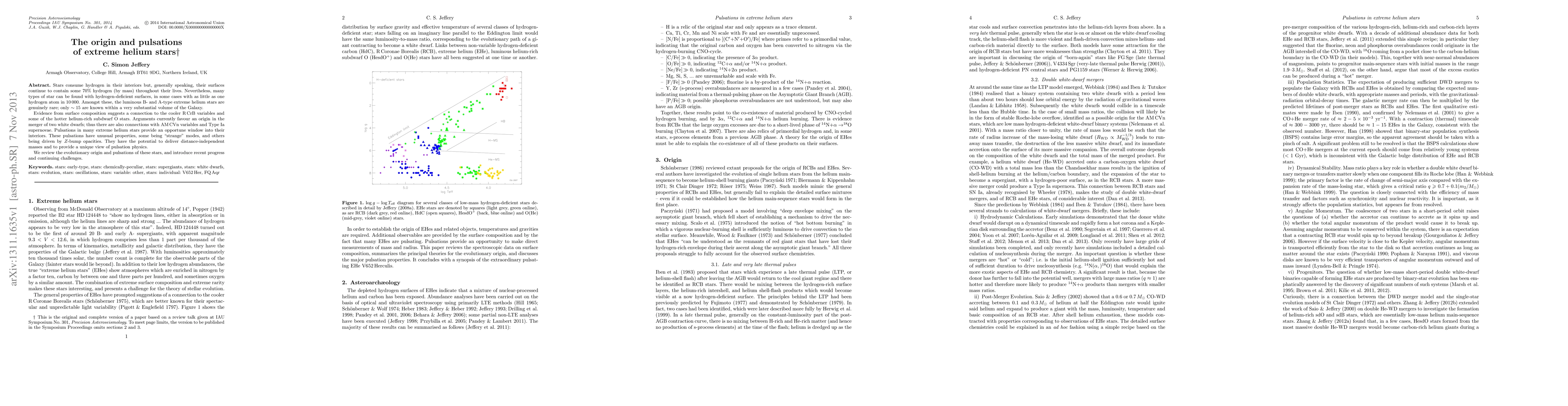 Stars consume hydrogen in their interiors but, generally speaking, their surfaces continue to contain some 70% hydrogen (by mass) throughout their lives. Nevertheless, many types of star can be found with hydrogen-deficient surfaces, in some cases with as little as one hydrogen atom in 10 000. Amongst these, the luminous B- and A-type extreme helium stars are genuinely rare; only ~15 are known within a very substantial volume of the Galaxy. Evidence from surface composition suggests a connection to the cooler R CrB variables and some of the hotter helium-rich subdwarf O stars. Arguments currently favour an origin in the merger of two white dwarfs; thus there are also connections with AM CVn variables and Type Ia supernovae. Pulsations in many extreme helium stars provide an opportune window into their interiors. These pulsations have unusual properties, some being "strange" modes, and others being driven by Z-bump opacities. They have the potential to deliver distance-independent masses and to provide a unique view of pulsation physics. We review the evolutionary origin and pulsations of these stars, and introduce recent progress and continuing challenges.