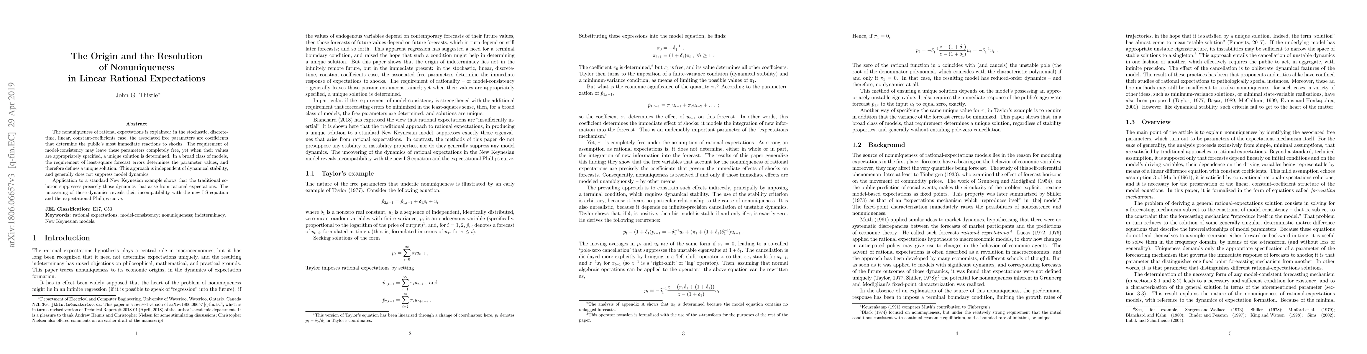 The nonuniqueness of rational expectations is explained: in the stochastic, discrete-time, linear, constant-coefficients case, the associated free parameters are coefficients that determine the public's most immediate reactions to shocks. The requirement of model-consistency may leave these parameters completely free, yet when their values are appropriately specified, a unique solution is determined. In a broad class of models, the requirement of least-square forecast errors determines the parameter values, and therefore defines a unique solution. This approach is independent of dynamical stability, and generally does not suppress model dynamics. Application to a standard New Keynesian example shows that the traditional solution suppresses precisely those dynamics that arise from rational expectations. The uncovering of those dynamics reveals their incompatibility with the new I-S equation and the expectational Phillips curve.
