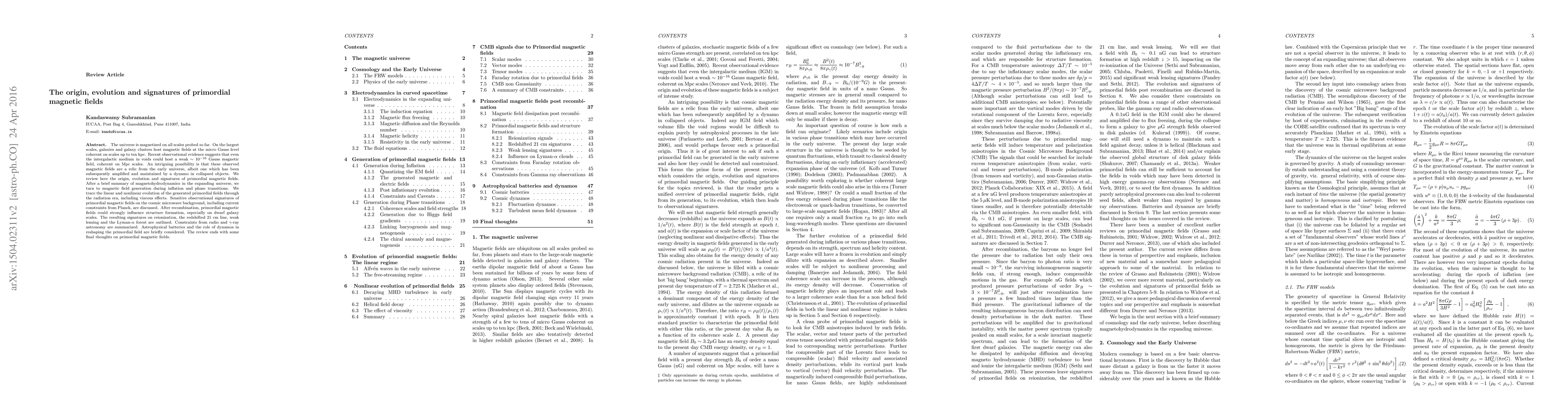 This paper reviews the origin, evolution, and observational signatures of primordial magnetic fields, exploring their potential to influence cosmic structure formation and their amplification through dynamos. It discusses theoretical generation during inflation and phase transitions, observational constraints, and signatures in cosmic microwave background, 21 cm line, weak lensing, and more.