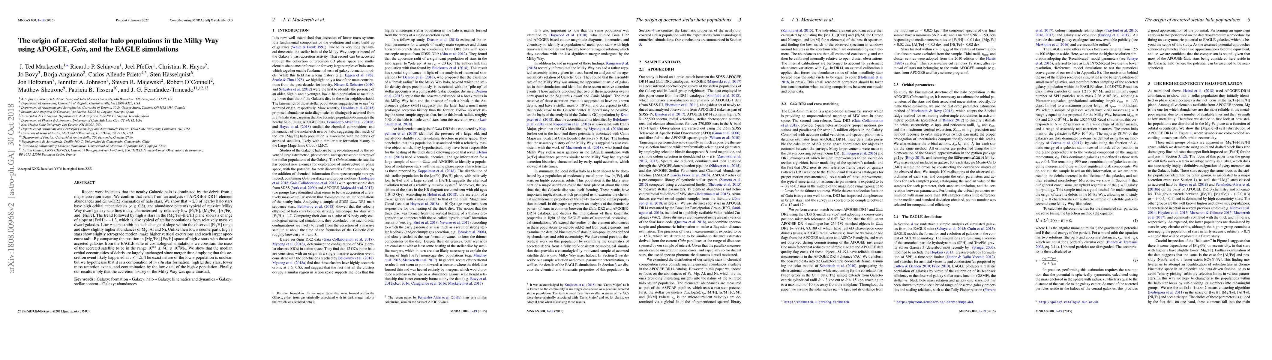Recent work indicates that the nearby Galactic halo is dominated by the debris from a major accretion event. We confirm that result from an analysis of APOGEE-DR14 element abundances and $\textit{Gaia}$-DR2 kinematics of halo stars. We show that $\sim$2/3 of nearby halo stars have high orbital eccentricities ($e \gtrsim 0.8$), and abundance patterns typical of massive Milky Way dwarf galaxy satellites today, characterised by relatively low [Fe/H], [Mg/Fe], [Al/Fe], and [Ni/Fe]. The trend followed by high $e$ stars in the [Mg/Fe]-[Fe/H] plane shows a change of slope at [Fe/H]$\sim-1.3$, which is also typical of stellar populations from relatively massive dwarf galaxies. Low $e$ stars exhibit no such change of slope within the observed [Fe/H] range and show slightly higher abundances of Mg, Al and Ni. Unlike their low $e$ counterparts, high $e$ stars show slightly retrograde motion, make higher vertical excursions and reach larger apocentre radii. By comparing the position in [Mg/Fe]-[Fe/H] space of high $e$ stars with those of accreted galaxies from the EAGLE suite of cosmological simulations we constrain the mass of the accreted satellite to be in the range $10^{8.5}\lesssim M_*\lesssim 10^{9}\mathrm{M_\odot}$. We show that the median orbital eccentricities of debris are largely unchanged since merger time, implying that this accretion event likely happened at $z\lesssim1.5$. The exact nature of the low $e$ population is unclear, but we hypothesise that it is a combination of $\textit{in situ}$ star formation, high $|z|$ disc stars, lower mass accretion events, and contamination by the low $e$ tail of the high $e$ population. Finally, our results imply that the accretion history of the Milky Way was quite unusual.