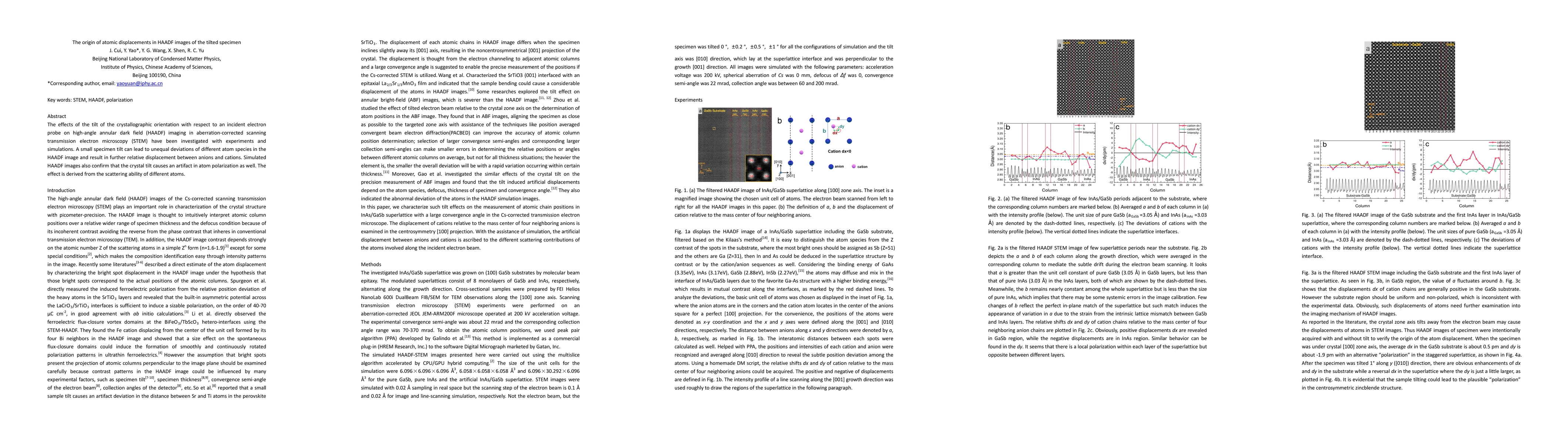 This study investigates how tilting a specimen affects high-angle annular dark field (HAADF) imaging in aberration-corrected scanning transmission electron microscopy (STEM), revealing that small tilts can cause unequal displacements of different atom species and artifacts in atom polarization due to varying scattering abilities.