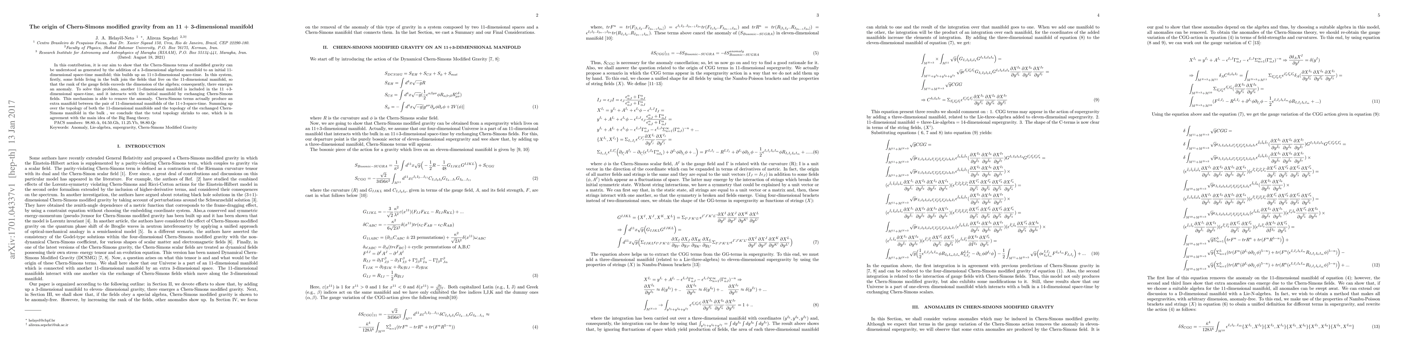 This paper demonstrates that Chern-Simons modified gravity arises from an 11+3-dimensional space-time by adding a 3-dimensional algebraic manifold to an initial 11-dimensional manifold, leading to an anomaly. The anomaly is resolved by introducing a second 11-dimensional manifold that interacts with the first via Chern-Simons fields, ultimately shrinking the total topology to one, aligning with the Big Bang theory.