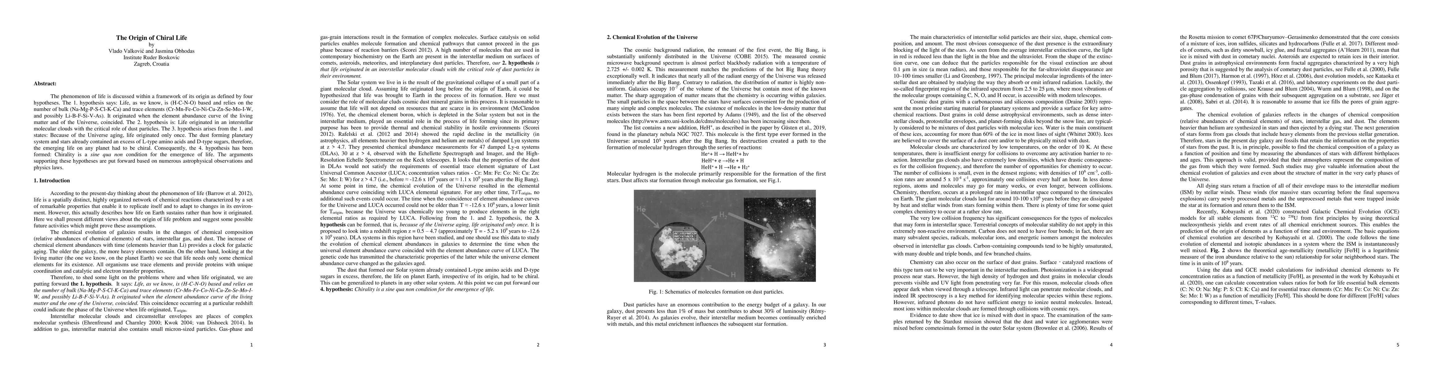 The paper proposes four hypotheses about the origin of chiral life, suggesting life is (H-C-N-O) based with specific element abundance, originating when cosmic element curves align. It also posits life began in interstellar clouds with dust particles playing a crucial role, and that life emerged only once due to pre-existing chiral molecules in dust, making chirality a necessity for life's emergence. These hypotheses are supported by astrophysical observations and physical laws.