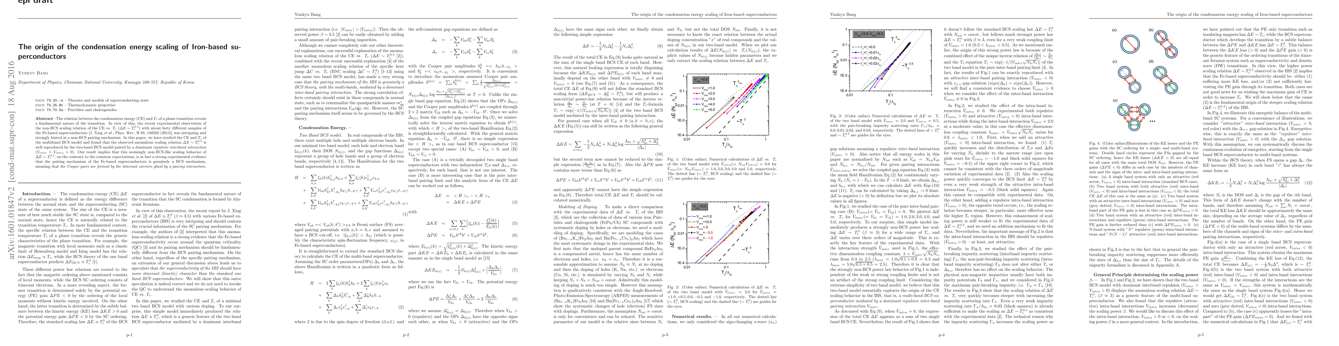 Motivated by the recent experiment of the non-BCS scaling relation of the condensation energy $\Delta CE$ vs. $T_c$ ($\Delta CE \sim T_c ^{\beta}, \beta\approx 3.5$) [PRB 89 140503 (2014)] for the Fe-based superconductors, we studied the CE and $T_c$ of the multiband BCS superconductors. We showed that the experimentally observed anomalous scaling relation $\Delta CE \sim T_c ^{3.5}$ is well reproduced by the two-band BCS superconductor paired by a dominant interband interaction ($V_{inter} > V_{intra}$). Our result implies that this seemingly non-BCS-like scaling behavior, on the contrary to the common expectation, is in fact a strong experimental evidence that the pairing mechanism of the Fe-based superconductors is genuinely a BCS mechanism, meaning that "the Cooper pairs are formed by the itinerant carriers glued by a pairing interaction."