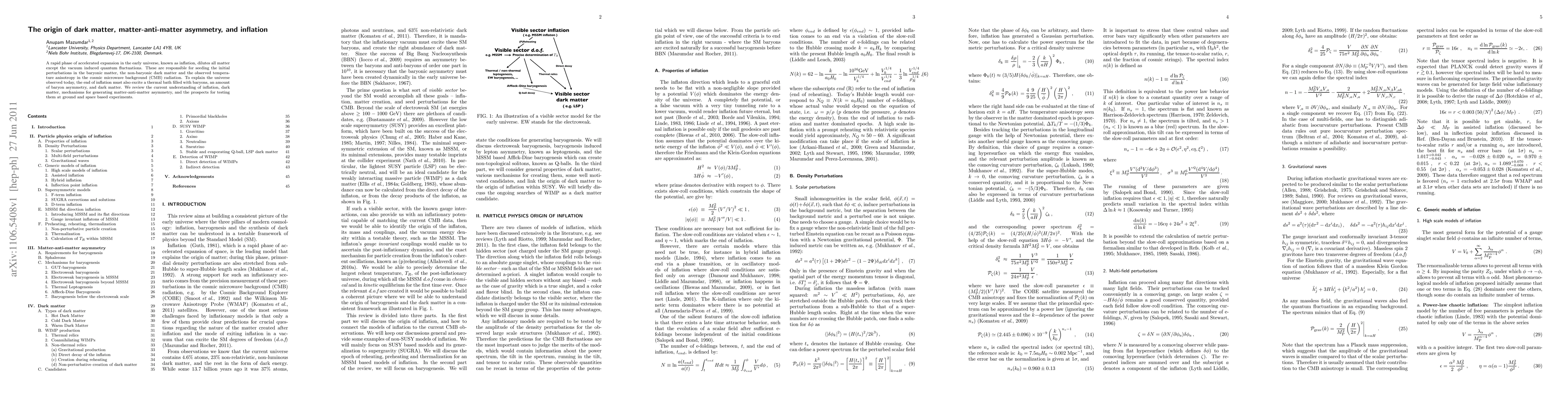 This paper reviews the role of inflation in the early universe, linking it to the origins of dark matter, matter-antimatter asymmetry, and the initial perturbations seen in the cosmic microwave background. It also explores mechanisms for generating baryon asymmetry and the potential for experimental tests.
