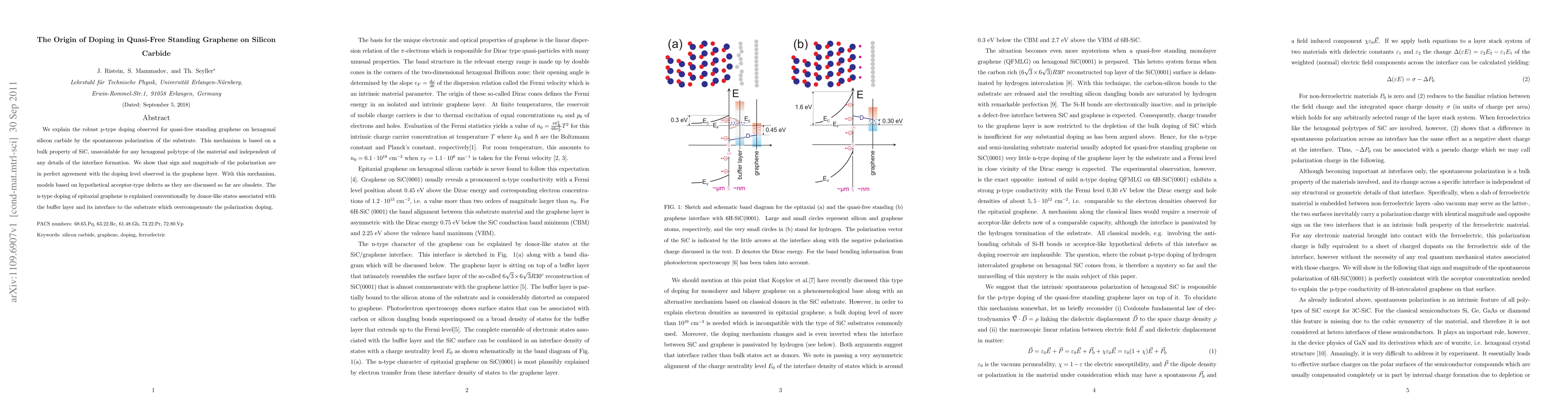 This paper explains the robust p-type doping in quasi-free standing graphene on silicon carbide through the substrate's spontaneous polarization, rendering traditional defect-based models obsolete. The observed doping level aligns with the polarization effect, while n-type doping in epitaxial graphene is attributed to donor-like states in the buffer layer.