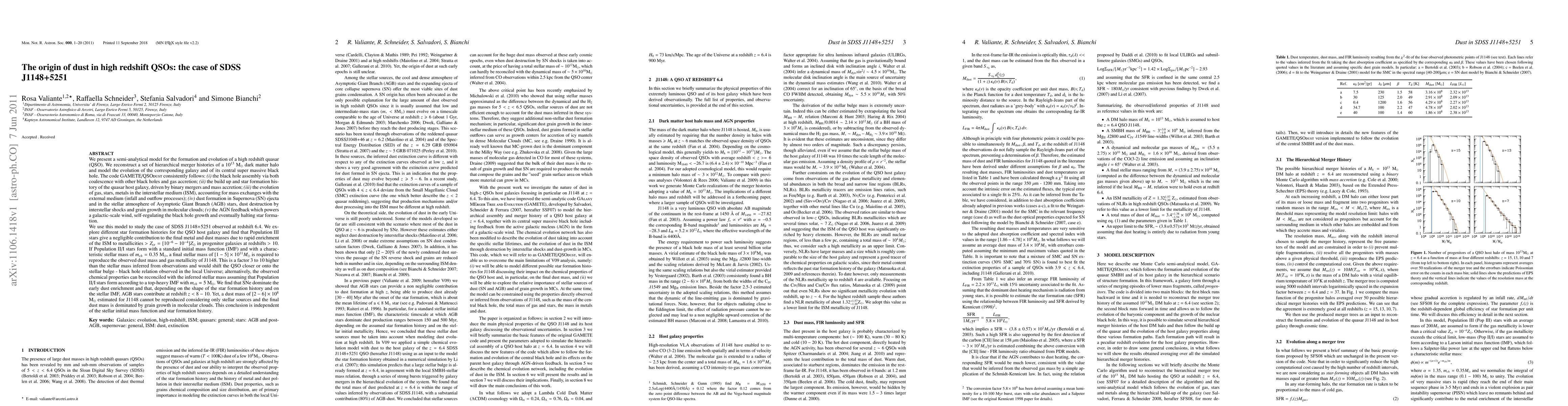 This paper presents a semi-analytical model to study the formation and evolution of high redshift quasars, focusing on SDSS J1148+5251. The model simulates the hierarchical merger history of a 10^13 Msun dark matter halo and the dust formation processes in the quasar host galaxy, including supernova ejecta and AGB stars.