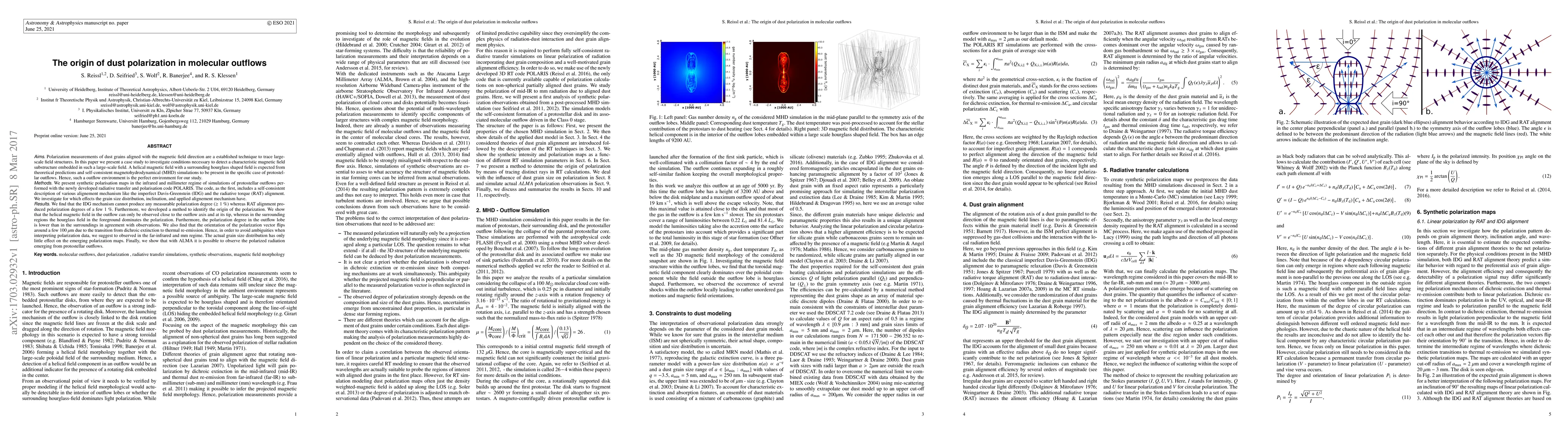 This paper investigates the origin of dust polarization in protostellar outflows using synthetic polarization maps and a new code POLARIS. It finds that radiative torque alignment (RAT) produces measurable polarization, while the imperfect Davis-Greenstein mechanism does not. The study suggests observing in the far-infrared and mm regime to avoid ambiguities and highlights the potential of ALMA for such observations.