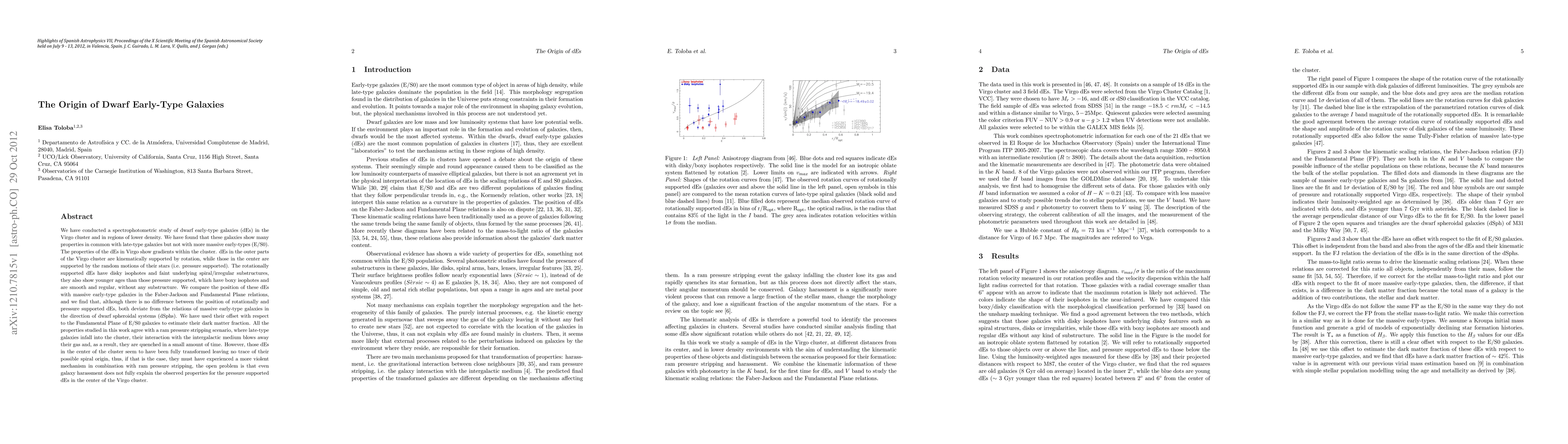 Abridge. We have conducted a spectrophotometric study of dwarf early-type galaxies (dEs) in the Virgo cluster and in regions of lower density. We have found that these galaxies show many properties in common with late-type galaxies but not with more massive early-types (E/S0). The properties of the dEs in Virgo show gradients within the cluster. dEs in the outer parts of the Virgo cluster are kinematically supported by rotation, while those in the center are supported by the random motions of their stars (i.e. pressure supported). The rotationally supported dEs have disky isophotes and faint underlying spiral/irregular substructures, they also show younger ages than those pressure supported, which have boxy isophotes and are smooth and regular, without any substructure. We compare the position of these dEs with massive early-type galaxies in the Faber-Jackson and Fundamental Plane relations, and we find that, although there is no difference between the position of rotationally and pressure supported dEs, both deviate from the relations of massive early-type galaxies in the direction of dwarf spheroidal systems (dSphs). We have used their offset with respect to the Fundamental Plane of E/S0 galaxies to estimate their dark matter fraction. All the properties studied in this work agree with a ram pressure stripping scenario, where late-type galaxies infall into the cluster, their interaction with the intergalactic medium blows away their gas and, as a result, they are quenched in a small amount of time. However, those dEs in the center of the cluster seem to have been fully transformed leaving no trace of their possible spiral origin, thus, if that is the case, they must have experienced a more violent mechanism in combination with ram pressure stripping.