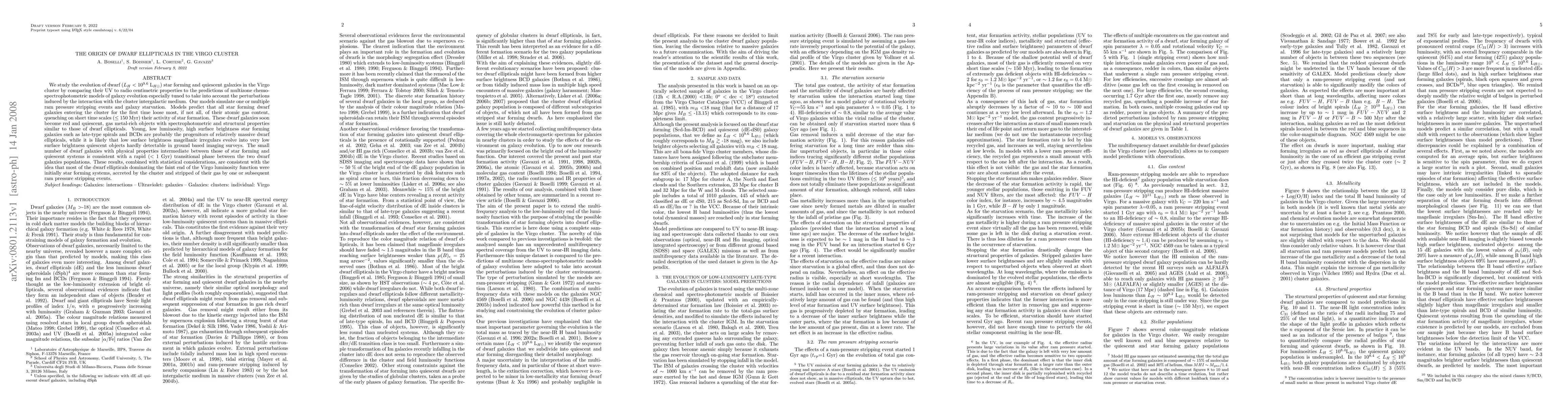 We study the evolution of dwarf (L_H < 10^{9.6} L_Ho) star forming and quiescent galaxies in the Virgo cluster by comparing their UV to radio centimetric properties to the predictions of multizone chemo-spectrophotometric models of galaxy evolution especially tuned to take into account the perturbations induced by the interaction with the cluster intergalactic medium. Our models simulate one or multiple ram pressure stripping events and galaxy starvation. Models predict that all star forming dwarf galaxies entering the cluster for the first time loose most, if not all, of their atomic gas content, quenching on short time scales (< 150 Myr) their activity of star formation. These dwarf galaxies soon become red and quiescent, gas metal-rich objects with spectrophotometric and structural properties similar to those of dwarf ellipticals. Young, low luminosity, high surface brightness star forming galaxies such as late-type spirals and BCDs are probably the progenitors of relatively massive dwarf ellipticals, while it is likely that low surface brightness magellanic irregulars evolve into very low surface brightness quiescent objects hardly detectable in ground based imaging surveys. The small number of dwarf galaxies with physical properties intermediate between those of star forming and quiescent systems is consistent with a rapid (< 1 Gyr) transitional phase between the two dwarf galaxies populations. These results, combined with statistical considerations, are consistent with the idea that most of the dwarf ellipticals dominating the faint end of the Virgo luminosity function were initially star forming systems, accreted by the cluster and stripped of their gas by one or subsequent ram pressure stripping events.
