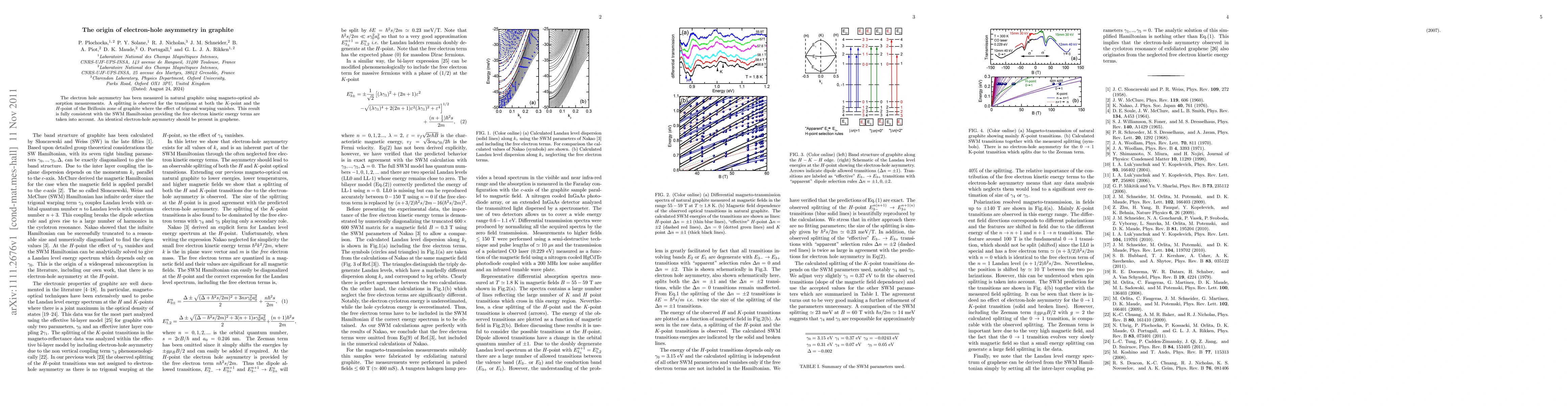 The study reveals electron-hole asymmetry in natural graphite via magneto-optical absorption, showing splitting at $K$-point and $H$-point despite trigonal warping effects. The findings align with the SWM Hamiltonian when free electron kinetic energy terms are considered, suggesting similar asymmetry in graphene.