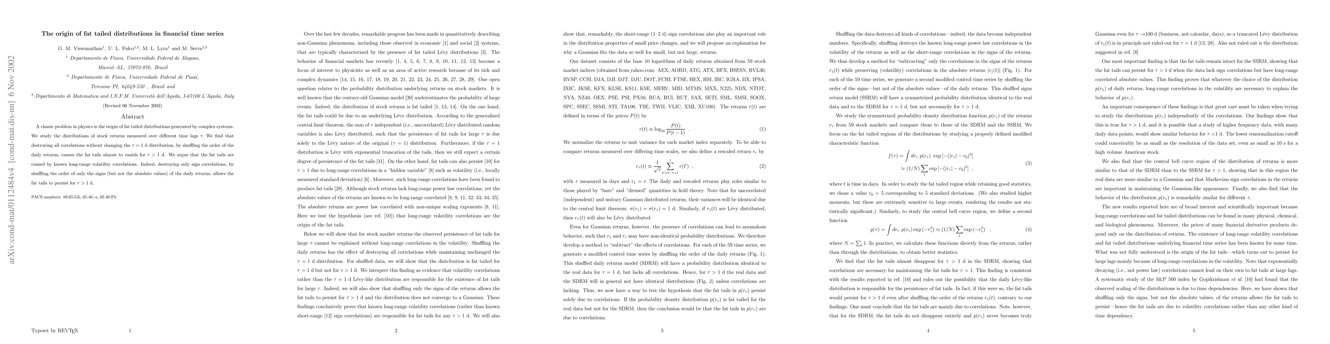 This paper investigates the origin of fat-tailed distributions in financial time series, finding that long-range volatility correlations, rather than the order of returns, are the primary cause of these distributions. Shuffling daily returns to eliminate correlations while preserving their order diminishes the fat tails, indicating the importance of these correlations.