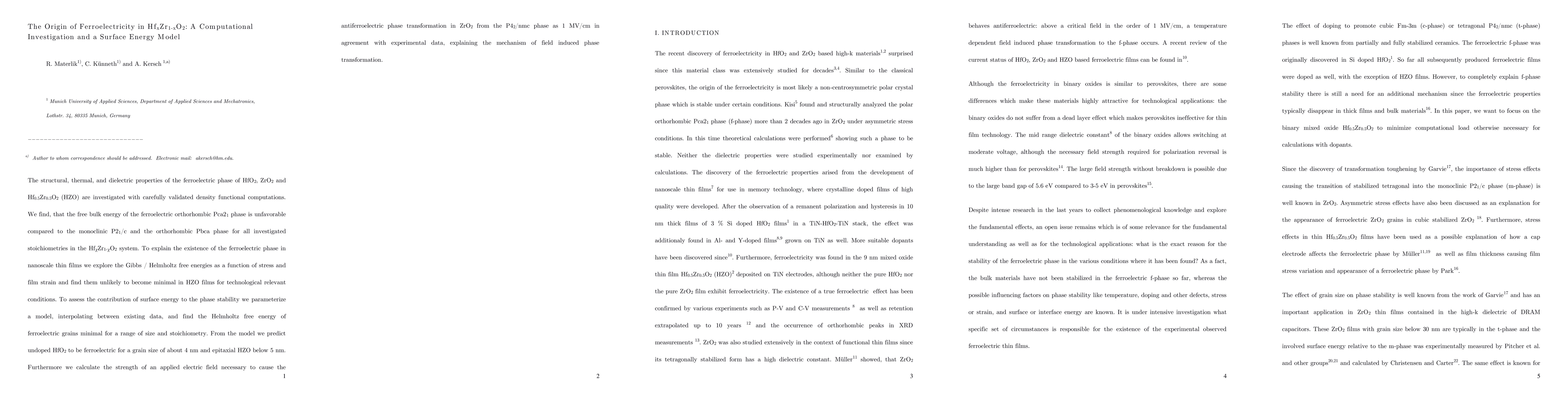 The structural, thermal, and dielectric properties of the ferroelectric phase of HfO$_2$, ZrO$_2$ and Hf$_{0.5}$ Zr$_{0.5}$ O$_2$ (HZO) are investigated with carefully validated density functional computations. We find, that the free bulk energy of the ferroelectric orthorhombic Pca2$_{1}$ phase is unfavorable compared to the monoclinic P2$_{1}$/c and the orthorhombic Pbca phase for all investigated stoichiometries in the Hf$_{\chi}$Zr$_{1-\chi}$O$_2$ system. To explain the existence of the ferroelectric phase in nanoscale thin films we explore the Gibbs / Helmholtz free energies as a function of stress and film strain and find them unlikely to become minimal in HZO films for technological relevant conditions. To assess the contribution of surface energy to the phase stability we parameterize a model, interpolating between existing data, and find the Helmholtz free energy of ferroelectric grains minimal for a range of size and stoichiometry. From the model we predict undoped HfO$_2$ to be ferroelectric for a grain size of about 4 nm and epitaxial HZO below 5 nm. Furthermore we calculate the strength of an applied electric field necessary to cause the antiferroelectric phase transformation in ZrO$_2$ from the P4$_2$/nmc phase as 1 MV/cm in agreement with experimental data, explaining the mechanism of field induced phase transformation.