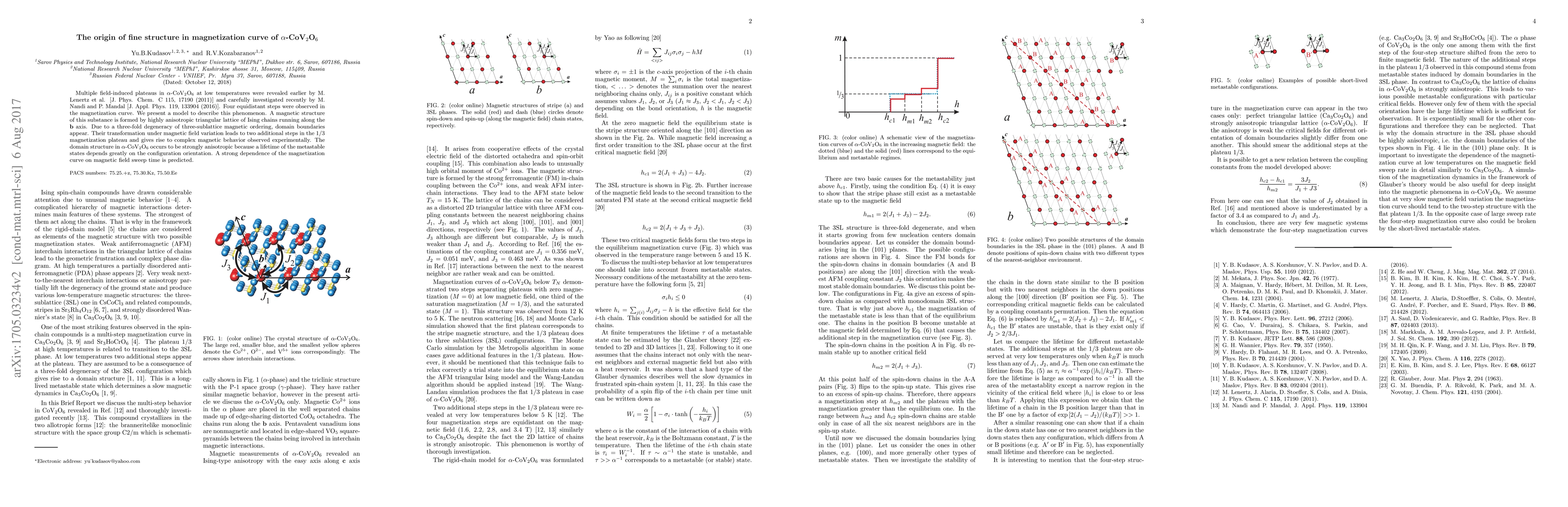 Multiple field-induced plateaus in $\alpha$-CoV$_2$O$_6$ at low temperatures were revealed earlier by M. Lenertz et al. [J. Phys. Chem. C 115, 17190 (2011)] and carefully investigated recently by M. Nandi and P. Mandal [J. Appl. Phys. 119, 133904 (2016)]. Four equidistant steps were observed in the magnetization curve. We present a model to describe this phenomenon. A magnetic structure of this substance is formed by highly anisotropic triangular lattice of Ising chains running along the $\bf{b}$ axis. Due to a three-fold degeneracy of three-sublattice magnetic ordering, domain boundaries appear. Their transformation under magnetic field variation leads to two additional steps in the 1/3 magnetization plateau and gives rise to complex magnetic behavior observed experimentally. The domain structure in $\alpha$-CoV$_2$O$_6$ occurs to be strongly anisotropic because a lifetime of the metastable states depends greatly on the configuration orientation. A strong dependence of the magnetization curve on magnetic field sweep time is predicted.