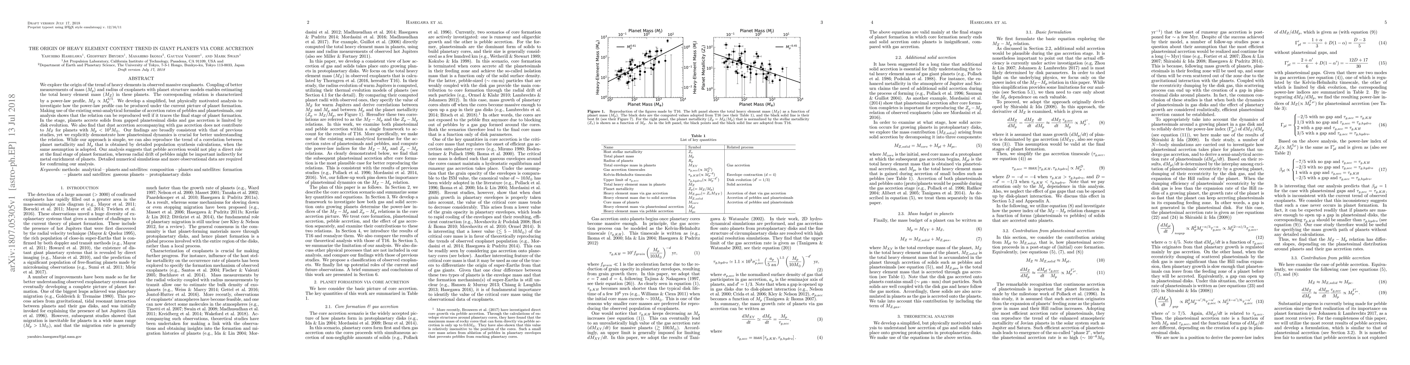 We explore the origin of the trend of heavy elements in observed massive exoplanets. Coupling of better measurements of mass ($M_p$) and radius of exoplanets with planet structure models enables estimating the total heavy element mass ($M_Z$) in these planets. The corresponding relation is characterized by a power-law profile, $M_Z \propto M_p^{3/5}$. We develop a simplified, but physically motivated analysis to investigate how the power-law profile can be produced under the current picture of planet formation. Making use of the existing semi-analytical formulae of accretion rates of pebbles and planetesimals, our analysis shows that the relation can be reproduced well if it traces the final stage of planet formation. In the stage, planets accrete solids from gapped planetesimal disks and gas accretion is limited by disk evolution. We also find that dust accretion accompanying with gas accretion does not contribute to $M_Z$ for planets with $M_p < 10^3 M_{\oplus}$. Our findings are broadly consistent with that of previous studies, yet we explicitly demonstrate how planetesimal dynamics is crucial for better understanding the relation. While our approach is simple, we can also reproduce the trend of a correlation between planet metallicity and $M_p$ that is obtained by detailed population synthesis calculations, when the same assumption is adopted. Our analysis suggests that pebble accretion would not play a direct role at the final stage of planet formation, whereas radial drift of pebbles might be important indirectly for metal enrichment of planets. Detailed numerical simulations and more observational data are required for confirming our analysis.