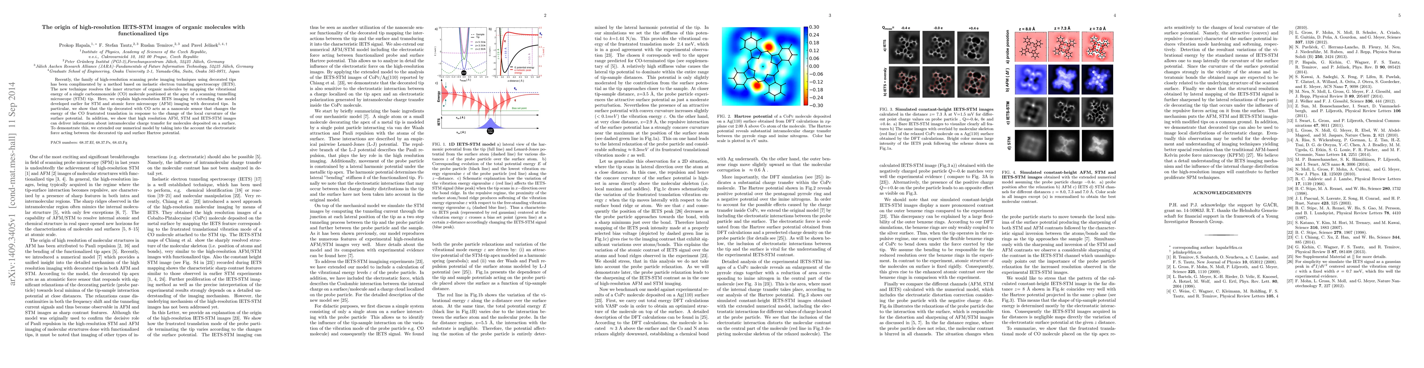 This paper explores high-resolution inelastic electron tunneling spectroscopy (IETS) imaging of organic molecules using functionalized scanning tunneling microscope (STM) tips, demonstrating that CO-functionalized tips act as nanoscale sensors that respond to local surface potential curvature, and that these techniques can reveal intramolecular charge transfer.