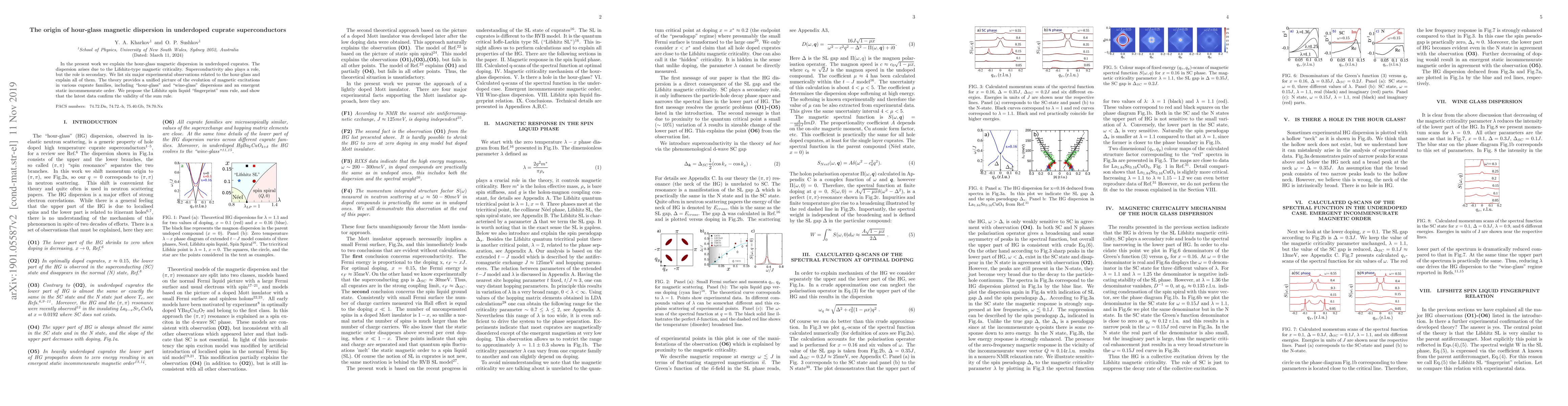 This paper explains the origin of the hour-glass magnetic dispersion in underdoped cuprate superconductors, attributing it to Lifshitz-type magnetic criticality, with superconductivity playing a secondary role. The theory unifies observations of magnetic excitations across various cuprate families and confirms the proposed Lifshitz spin liquid "fingerprint" sum rule with recent experimental data.