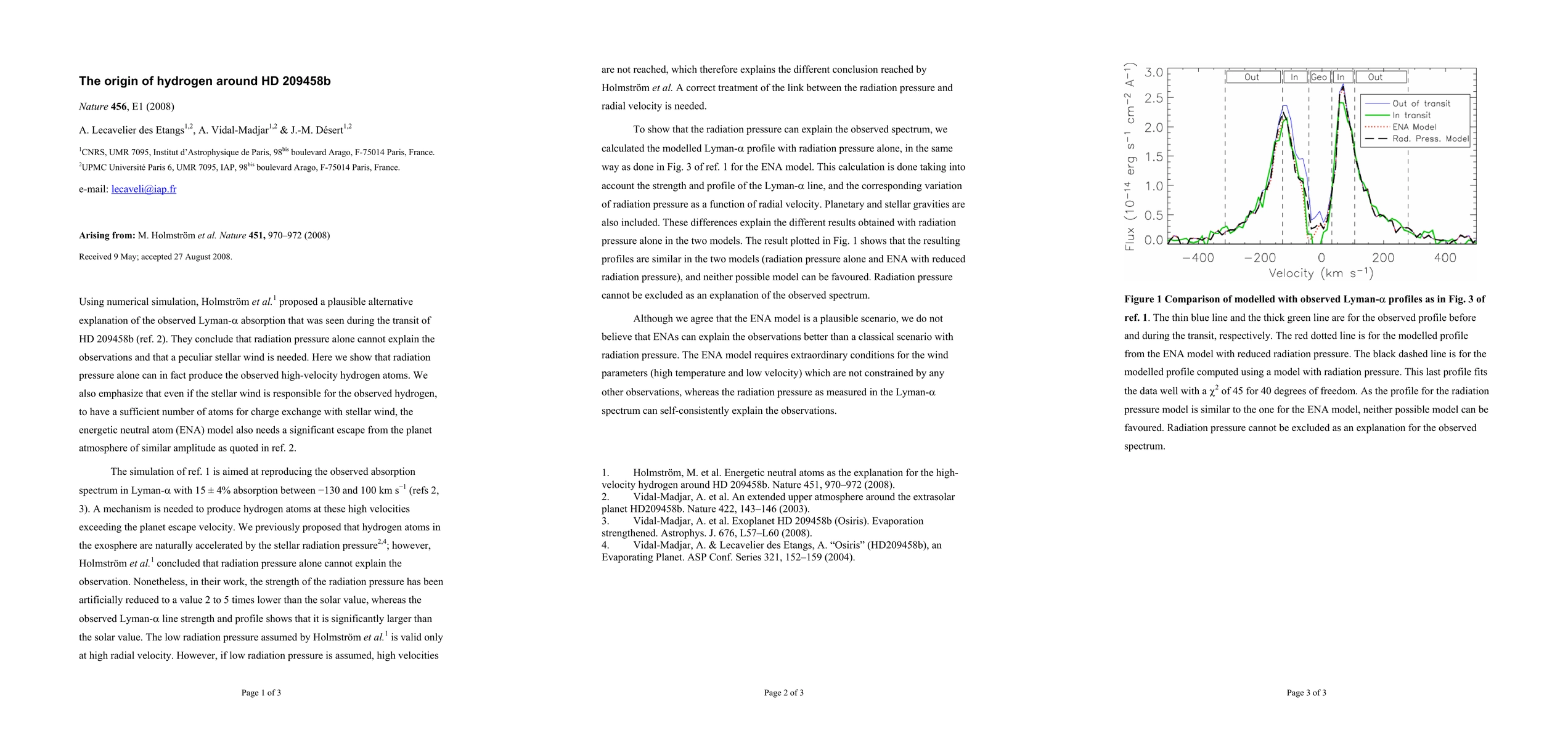 Using numerical simulation, Holmstrom et al. (2008) proposed a plausible alternative explanation of the observed Lyman-alpha absorption that was seen during the transit of HD 209458b (Vidal-Madjar et al. 2003). They conclude that radiation pressure alone cannot explain the observations and that a peculiar stellar wind is needed. Here we show that radiation pressure alone can in fact produce the observed high-velocity hydrogen atoms. We also emphasize that even if the stellar wind is responsible for the observed hydrogen, to have a sufficient number of atoms for charge exchange with stellar wind, the energetic neutral atom (ENA) model also needs a significant escape from the planet atmosphere of similar amplitude as quoted in Vidal-Madjar et al.(2003).