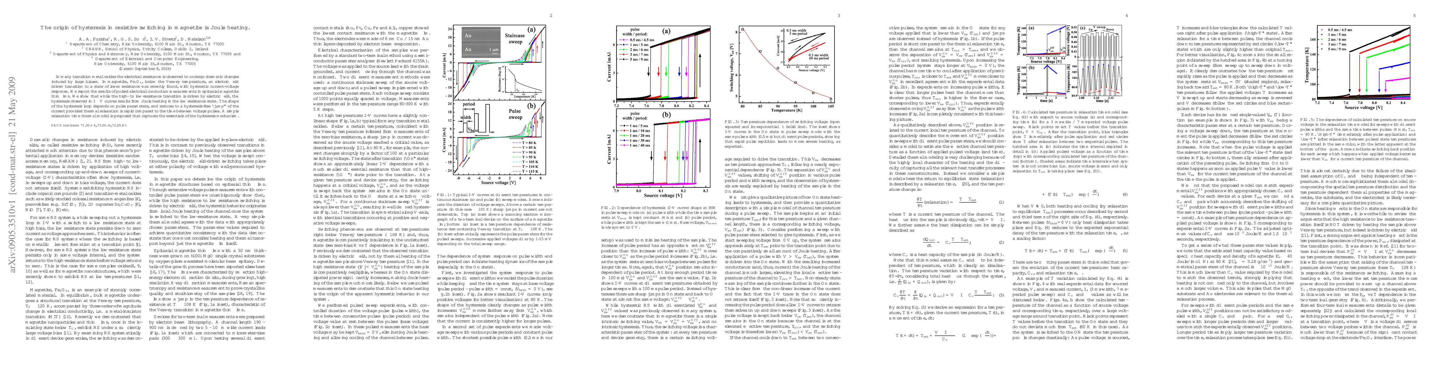 This paper investigates the resistive switching behavior in magnetite thin films, finding that the hysteresis in current-voltage curves is due to Joule heating rather than the electric field. A thermal model is proposed to explain the observed hysteresis, which depends on the pulse parameters and thermal relaxation rates.