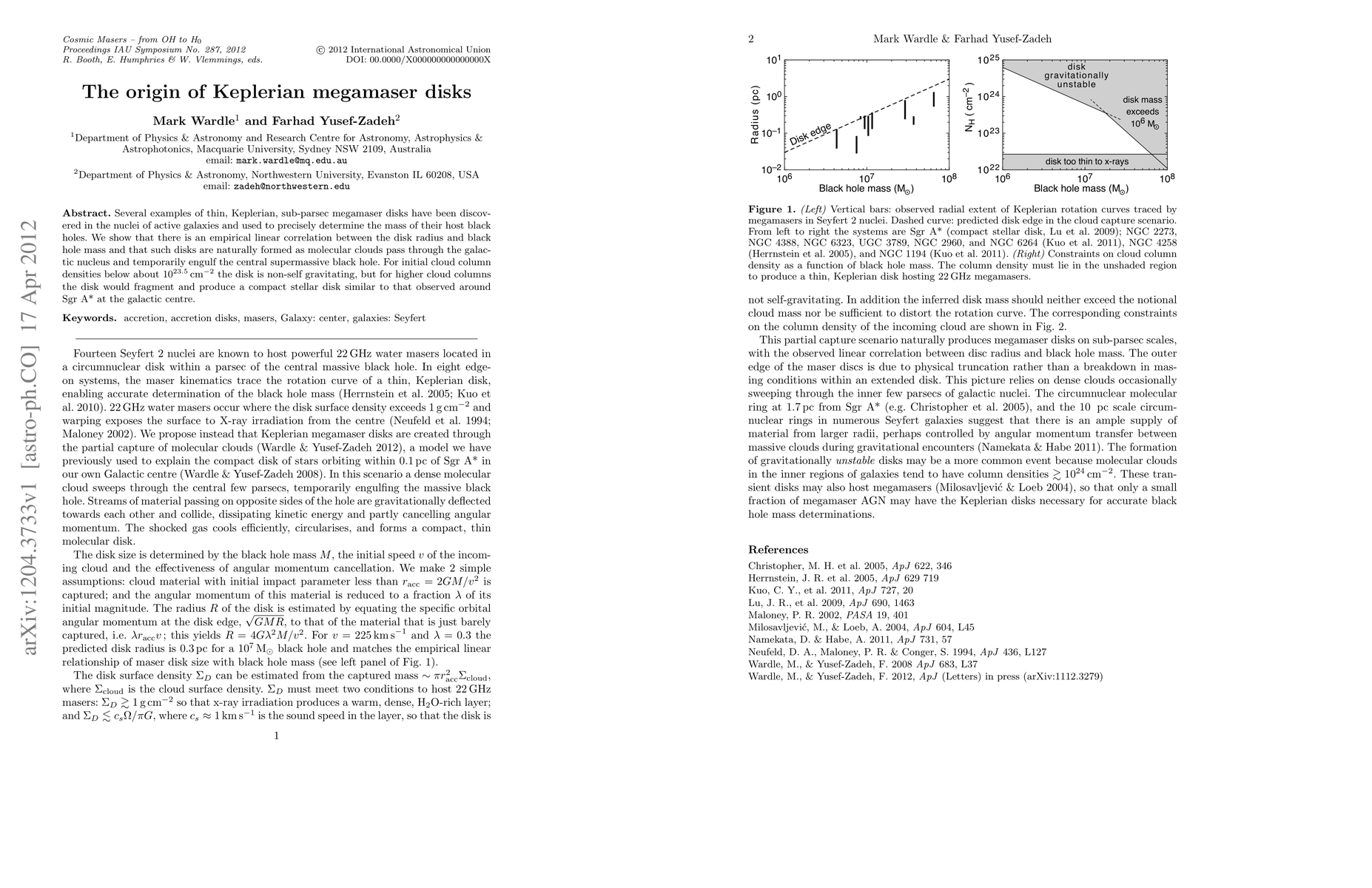 This paper explores the formation of Keplerian megamaser disks in active galaxies, revealing a linear correlation between disk radius and black hole mass. It posits that these disks form when molecular clouds pass through galactic nuclei and temporarily engulf the central black hole, potentially fragmenting into compact stellar disks under high column densities.