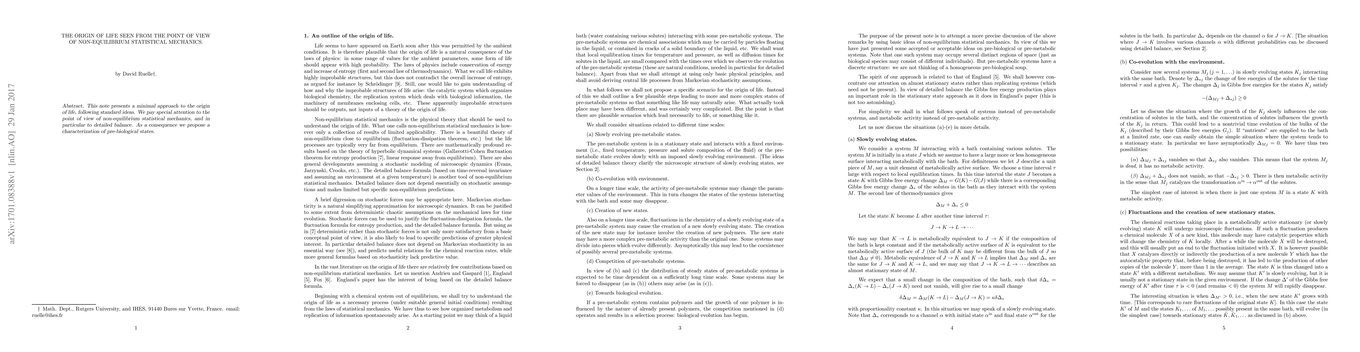 This note presents a minimal approach to the origin of life, following standard ideas. We pay special attention to the point of view of non-equilibrium statistical mechanics, and in particular to detailed balance. As a consequence we propose a characterization of pre-biological states.