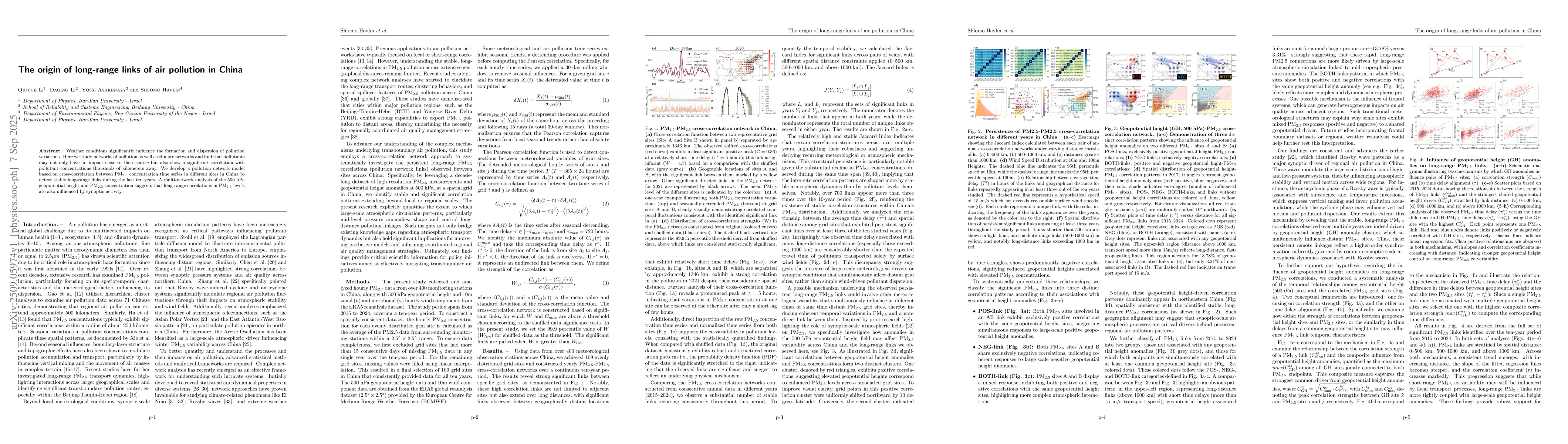 Weather conditions significantly influence the formation and dispersion of pollution variations. Here we study networks of pollution as well as climate networks and find that pollutants may not only have an impact close to their source but also show a significant correlation with pollutant concentrations thousands of kilometers away. We develop a pollution network model based on cross-correlation between PM2.5 concentration time series in different sites in China to detect stable long-range links during the last ten years. A multi-network analysis of the 500 hPa geopotential height and PM2.5 concentration suggests that long-range correlations in PM2.5 levels are also influenced by synoptic activity.