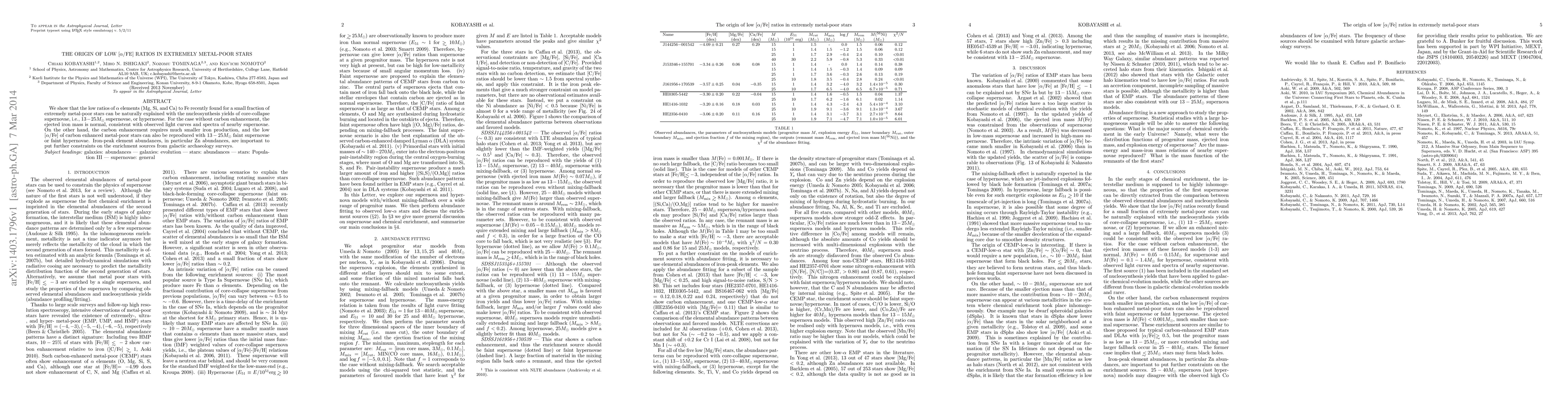 We show that the low ratios of $\alpha$ elements (Mg, Si, and Ca) to Fe recently found for a small fraction of extremely metal-poor stars can be naturally explained with the nucleosynthesis yields of core-collapse supernovae, i.e., $13-25M_\odot$ supernovae, or hypernovae. For the case without carbon enhancement, the ejected iron mass is normal, consistent with observed light curves and spectra of nearby supernovae. On the other hand, the carbon enhancement requires much smaller iron production, and the low [$\alpha$/Fe] of carbon enhanced metal-poor stars can also be reproduced with $13-25M_\odot$ faint supernovae or faint hypernovae. Iron-peak element abundances, in particular Zn abundances, are important to put further constraints on the enrichment sources from galactic archaeology surveys.