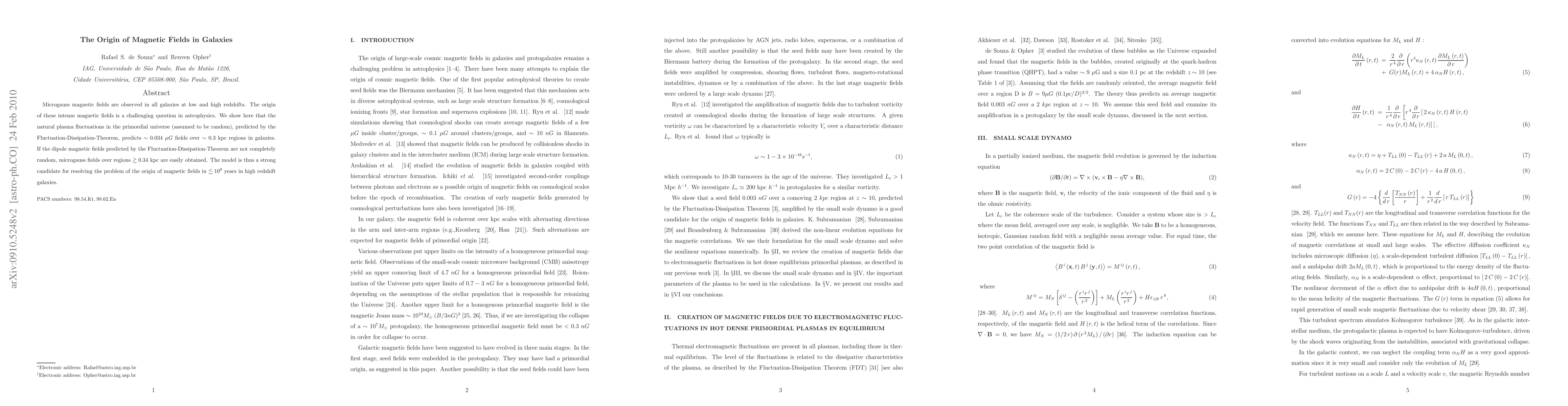 Microgauss magnetic fields are observed in all galaxies at low and high redshifts. The origin of these intense magnetic fields is a challenging question in astrophysics. We show here that the natural plasma fluctuations in the primordial universe (assumed to be random), predicted by the Fluctuation-Dissipation-Theorem, predicts $\sim 0.034 \mu G$ fields over $\sim 0.3$ kpc regions in galaxies. If the dipole magnetic fields predicted by the Fluctuation-Dissipation-Theorem are not completely random, microgauss fields over regions $\gtrsim 0.34$ kpc are easily obtained. The model is thus a strong candidate for resolving the problem of the origin of magnetic fields in $\lesssim 10^{9}$ years in high redshift galaxies.