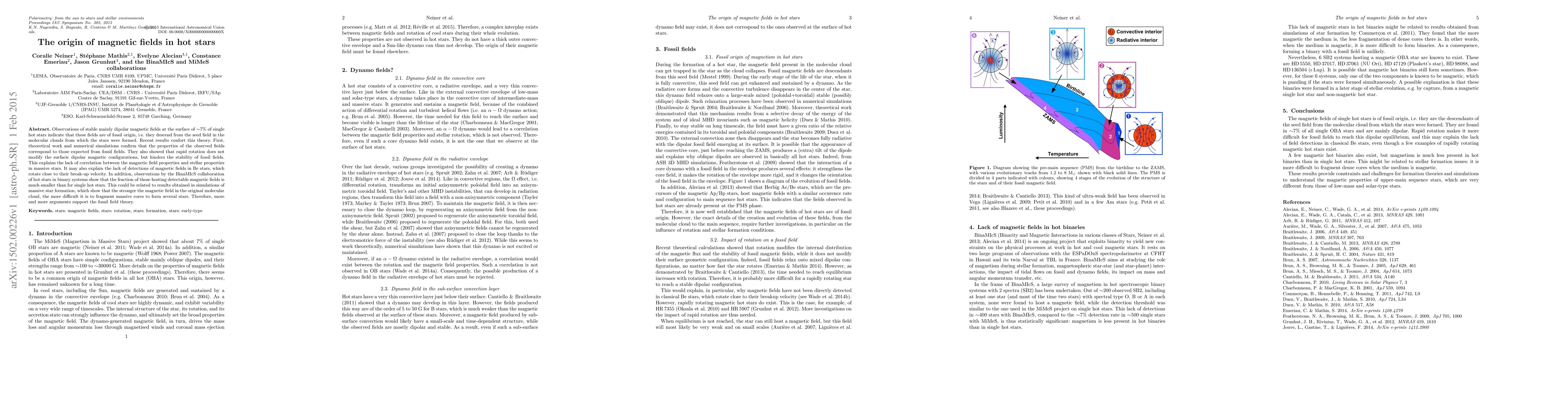 This paper supports the fossil field theory for magnetic fields in hot stars, showing that these fields originate from the molecular clouds in which the stars formed. Observations and simulations indicate that rapid rotation hinders field stability but maintains dipolar configurations, explaining the lack of magnetic field detection in fast-rotating Be stars.