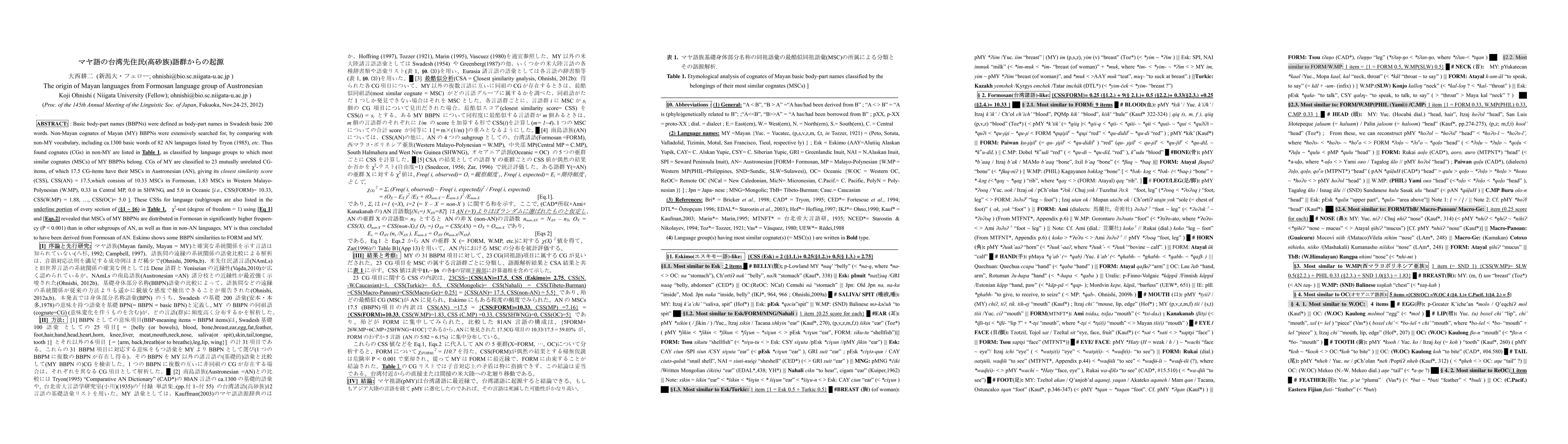 Basic body-part names (BBPNs) were defined as body-part names in Swadesh basic 200 words. Non-Mayan cognates of Mayan (MY) BBPNs were extensively searched for, by comparing with non-MY vocabulary, including ca.1300 basic words of 82 AN languages listed by Tryon (1985), etc. Thus found cognates (CGs) in non-MY are listed in Table 1, as classified by language groups to which most similar cognates (MSCs) of MY BBPNs belong. CGs of MY are classified to 23 mutually unrelated CG-items, of which 17.5 CG-items have their MSCs in Austronesian (AN), giving its closest similarity score (CSS), CSS(AN) = 17.5, which consists of 10.33 MSCs in Formosan, 1.83 MSCs in Western Malayo-Polynesian (W.MP), 0.33 in Central MP, 0.0 in SHWNG, and 5.0 in Oceanic [i.e., CSS(FORM)= 10.33, CSS(W.MP) = 1.88, ..., CSS(OC)= 5.0]. These CSSs for language (sub)groups are also listed in the underline portion of every section of (Section1 - Section 6) in Table 1. Chi-squar test (degree of freedom = 1) using [Eq 1] and [Eqs.2] revealed that MSCs of MY BBPNs are distributed in Formosan in significantly higher frequency (P < 0.001) than in other subgroups of AN, as well as than in non-AN languages. MY is thus concluded to have been derived from Formosan of AN. Eskimo shows some BBPN similarities to FORM and MY.