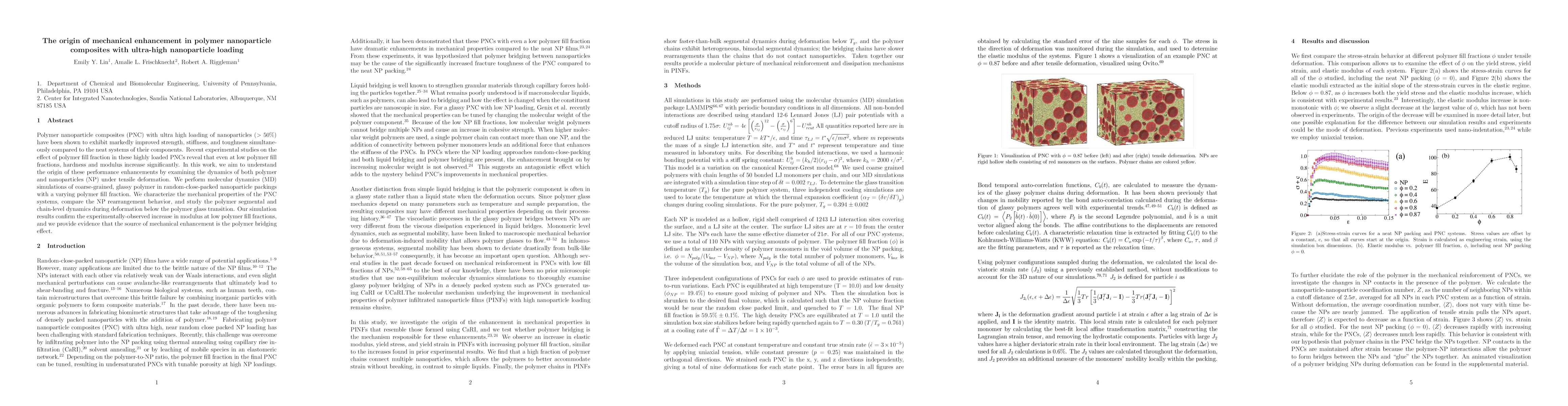 This paper investigates the mechanical enhancement in polymer nanoparticle composites with ultra-high nanoparticle loading (>50%) using molecular dynamics simulations. The study reveals that the polymer bridging effect is the primary source of the observed improvements in strength, stiffness, and toughness.