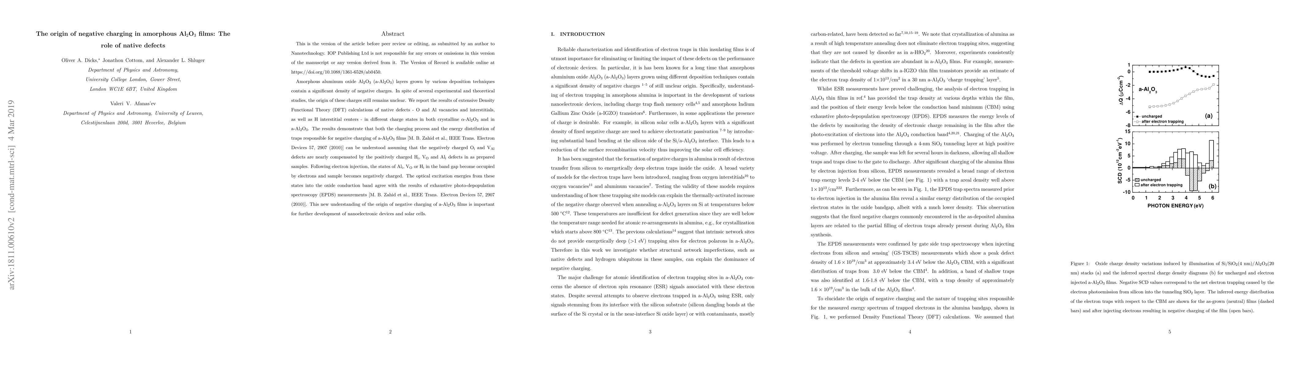 Amorphous aluminum oxide Al$_2$O$_3$ (a-Al$_2$O$_3$) layers grown by various deposition techniques contain a significant density of negative charges. In spite of several experimental and theoretical studies, the origin of these charges still remains unclear. We report the results of extensive Density Functional Theory (DFT) calculations of native defects - O and Al vacancies and interstitials, as well as H interstitial centers - in different charge states in both crystalline $\alpha$-Al$_2$O$_3$ and in a-Al$_2$O$_3$. The results demonstrate that both the charging process and the energy distribution of traps responsible for negative charging of a-Al$_2$O$_3$ films [M. B. Zahid et al., IEEE Trans. Electron Devices 57, 2907 (2010)] can be understood assuming that the negatively charged O$_{\textrm{i}}$ and V$_{\textrm{Al}}$ defects are nearly compensated by the positively charged H$_{\textrm{i}}$, V$_{\textrm{O}}$ and Al$_{\textrm{i}}$ defects in as prepared samples. Following electron injection, the states of Al$_{\textrm{i}}$, V$_{\textrm{O}}$ or H$_{\textrm{i}}$ in the band gap become occupied by electrons and sample becomes negatively charged. The optical excitation energies from these states into the oxide conduction band agree with the results of exhaustive photo-depopulation spectroscopy (EPDS) measurements [M. B. Zahid et al., IEEE Trans. Electron Devices 57, 2907 (2010)]. This new understanding of the origin of negative charging of a-Al$_2$O$_3$ films is important for further development of nanoelectronic devices and solar cells.