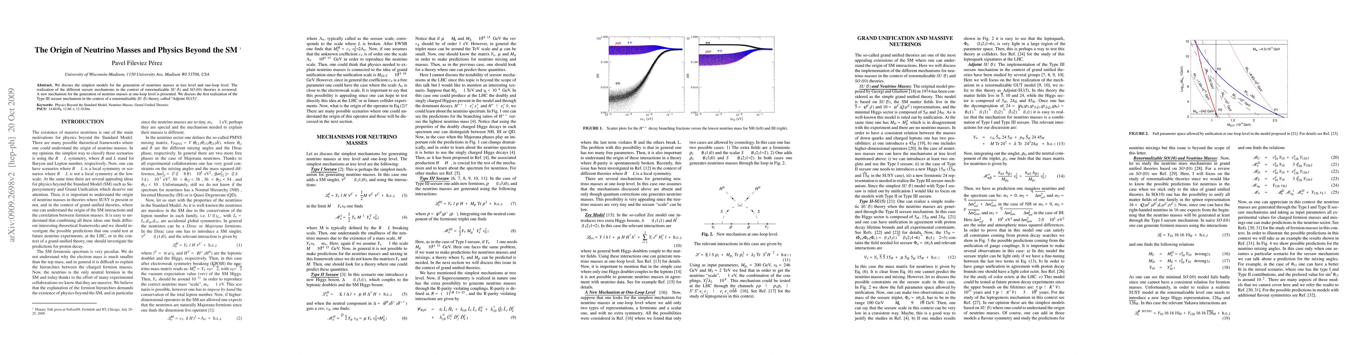 We discuss the simplest models for the generation of neutrinos masses at tree level and one-loop level. The realization of the different seesaw mechanisms in the context of renormalizable SU(5) and SO(10) theories is reviewed. A new mechanism for the generation of neutrino masses at one-loop level is presented. We discuss the first realization of the Type III seesaw mechanism in the context of a renormalizable SU(5) theory, called "Adjoint SU(5)".