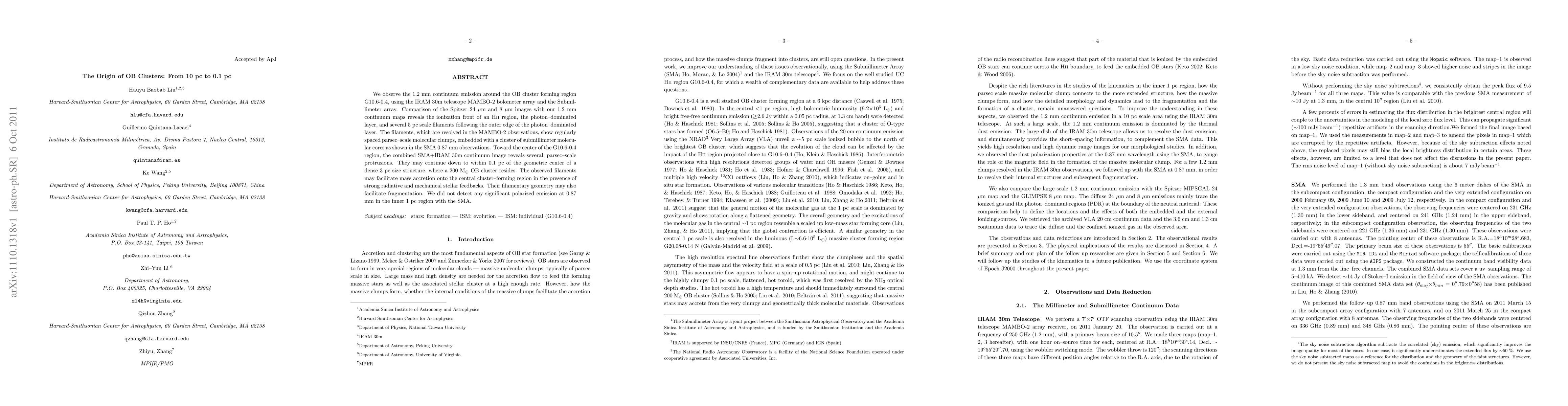 We observe the 1.2 mm continuum emission around the OB cluster forming region G10.6-0.4, using the IRAM 30m telescope MAMBO-2 bolometer array and the Submillimeter array. Comparison of the Spitzer 24 $\mu$m and 8 $\mu$m images with our 1.2 mm continuum maps reveals the ionization front of an HII region, the photon-dominated layer, and several 5 pc scale filaments following the outer edge of the photon-dominated layer. The filaments, which are resolved in the MAMBO-2 observations, show regularly spaced parsec-scale molecular clumps, embedded with a cluster of submillimeter molecular cores as shown in the SMA 0.87 mm observations. Toward the center of the G10.6-0.4 region, the combined SMA+IRAM 30m continuum image reveals several, parsec-scale protrusions. They may continue down to within 0.1 pc of the geometric center of a dense 3 pc size structure, where a 200 M$_{\odot}$ OB cluster resides. The observed filaments may facilitate mass accretion onto the central cluster--forming region in the presence of strong radiative and mechanical stellar feedbacks. Their filamentary geometry may also facilitate fragmentation. We did not detect any significant polarized emission at 0.87 mm in the inner 1 pc region with the SMA.