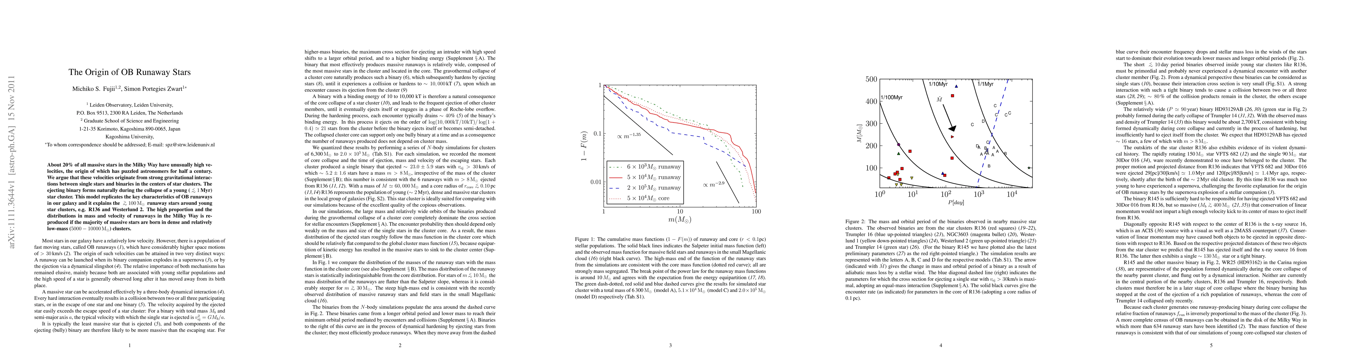 This paper proposes that the high velocities of OB runaway stars in the Milky Way result from gravitational interactions in dense young star clusters, where binaries eject single stars. The model explains the observed characteristics and distribution of these runaway stars, suggesting that most massive stars form in clusters of 5000-10000 solar masses.