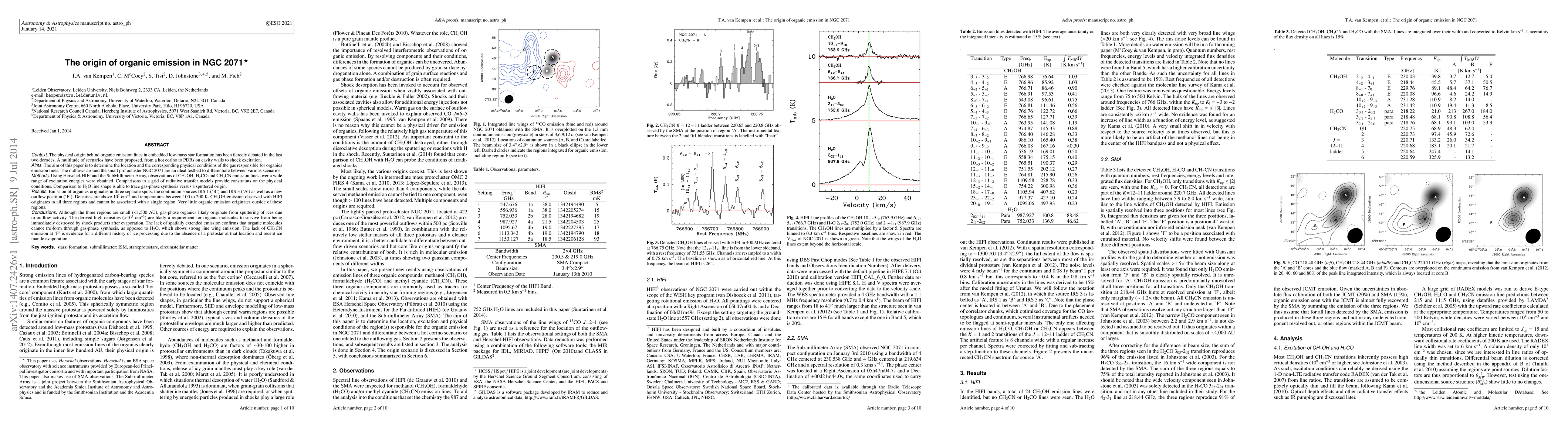 Context: The physical origin behind organic emission in embedded low-mass star formation has been fiercely debated in the last two decades. A multitude of scenarios have been proposed, from a hot corino to PDRs on cavity walls to shock excitation. Aims: The aim of this paper is to determine the location and the corresponding physical conditions of the gas responsible for organics emission lines. The outflows around the small protocluster NGC 2071 are an ideal testbed to differentiate between various scenarios. Methods: Using Herschel-HIFI and the SMA, observations of CH3OH, H2CO and CH3CN emission lines over a wide range of excitation energies were obtained. Comparisons to a grid of radiative transfer models provide constraints on the physical conditions. Comparison to H2O line shape is able to trace gas-phase synthesis versus a sputtered origin. Results: Emission of organics originates in three spots: the continuum sources IRS 1 ('B') and IRS 3 ('A') as well as a outflow position ('F'). Densities are above 10$^7$ cm$^{-3}$ and temperatures between 100 to 200 K. CH3OH emission observed with HIFI originates in all three regions and cannot be associated with a single region. Very little organic emission originates outside of these regions. Conclusions: Although the three regions are small (<1,500 AU), gas-phase organics likely originate from sputtering of ices due to outflow activity. The derived high densities (>10$^7$ cm$^{-3}$) are likely a requirement for organic molecules to survive from being destroyed by shock products. The lack of spatially extended emission confirms that organic molecules cannot (re)form through gas-phase synthesis, as opposed to H2O, which shows strong line wing emission. The lack of CH3CN emission at 'F' is evidence for a different history of ice processing due to the absence of a protostar at that location and recent ice mantle evaporation.