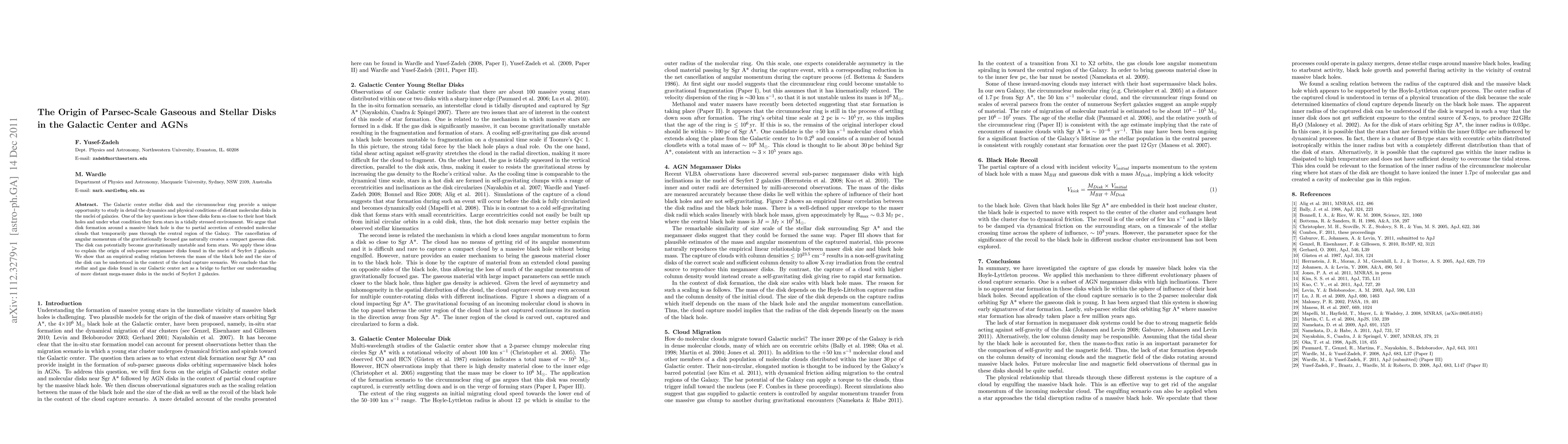 This paper explores the formation of parsec-scale gaseous and stellar disks near massive black holes, proposing that these disks form from the partial accretion of passing molecular clouds. It suggests that the cancellation of angular momentum leads to the creation of compact disks, which may become gravitationally unstable and form stars.
