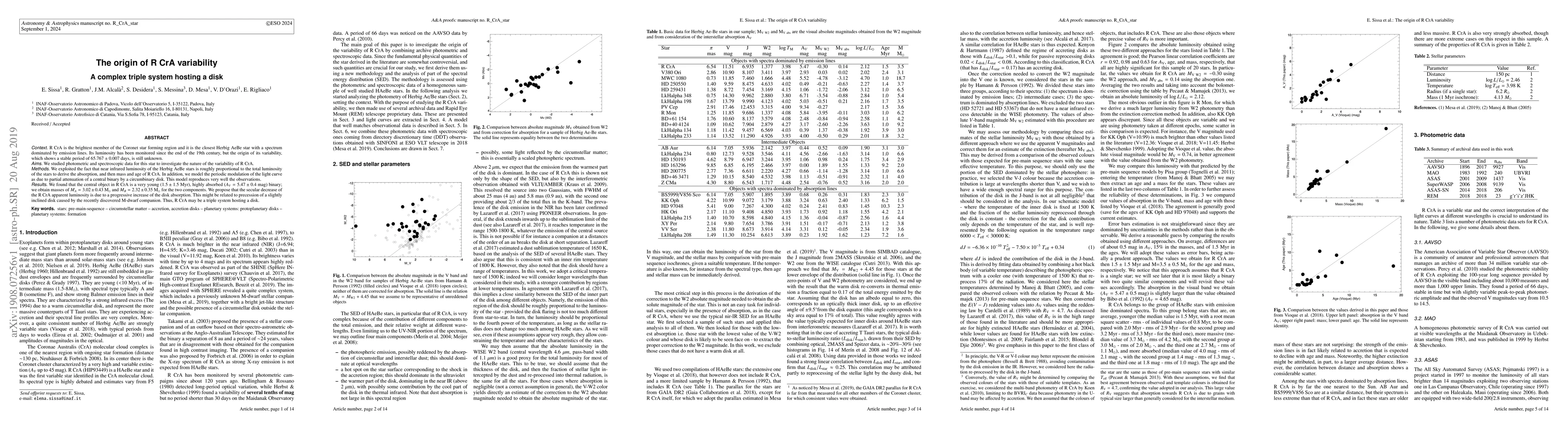 R~CrA is the brightest member of the Coronet star forming region and it is the closest Herbig AeBe star with a spectrum dominated by emission lines. Its luminosity has been monitored since the end of the 19th century, but the origin of its variability, which shows a stable period of $65.767\pm 0.007$~days, is still unknown. We studied photometric and spectroscopic data for this star to investigate the nature of the variability of R~CrA. We exploited the fact that near infrared luminosity of the Herbig AeBe stars is roughly proportional to the total luminosity of the stars to derive the absorption, and then mass and age of R~CrA. In addition, we model the periodic modulation of the light curve as due to partial attenuation of a central binary by a circumbinary disk. This model reproduces very well the observations. We found that the central object in R~CrA is a very young ($1.5\pm 1.5$~Myr), highly absorbed ($A_V=5.47\pm 0.4$~mag) binary; we obtain masses of $M_A=3.02\pm 0.43$~M$_\odot$ and $M_B=2.32\pm 0.35$~M$_\odot$ for the two components. We propose that the secular decrease of the R~CrA apparent luminosity is due to a progressive increase of the disk absorption. This might be related to precession of a slightly inclined disk caused by the recently discovered M-dwarf companion. Thus, R~CrA may be a triple system hosting a disk.