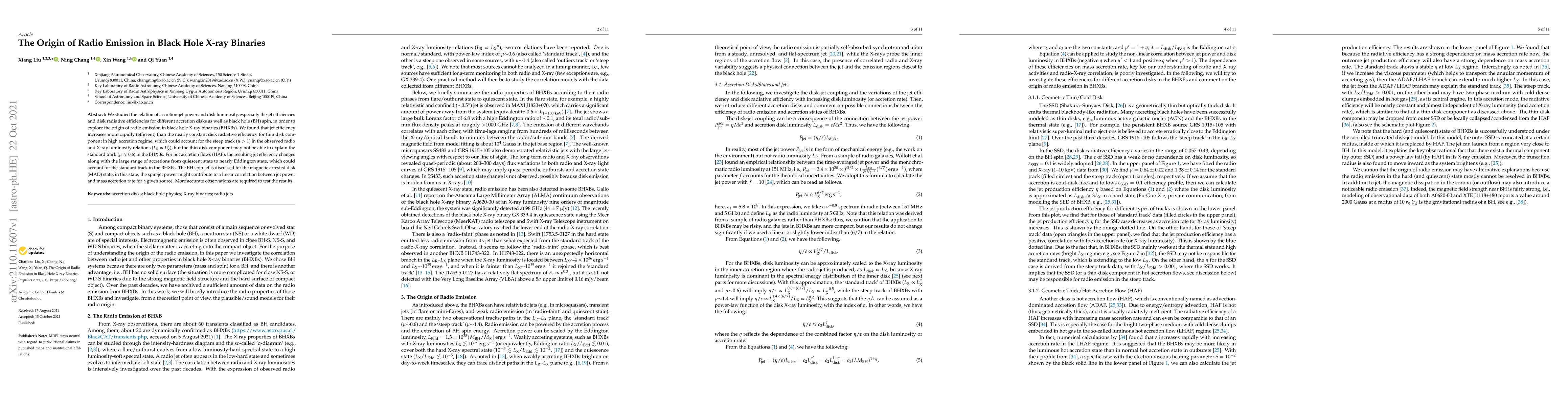 We studied the relation of accretion-jet power and disk luminosity, especially the jet efficiencies and disk radiative efficiencies for different accretion disks as well as black hole (BH) spin, in order to explore the origin of radio emission in black hole X-ray binaries (BHXBs). We found that jet efficiency increases more rapidly (efficient) than the nearly constant disk radiative efficiency for thin disk component in high accretion regime, which could account for the steep track ($\mu>1$) in the observed radio and X-ray luminosity relations ($L_{\rm R}\propto L_{\rm X}^{\mu}$), but the thin disk component may not be able to explain the standard track ($\mu\approx 0.6$) in the BHXBs. For hot accretion flows (HAF), the resulting jet efficiency changes along with the large range of accretions from quiescent state to nearly Eddington state, which could account for the standard track in the BHXBs. The BH spin-jet is discussed for the magnetic arrested disk (MAD) state; in this state, the spin-jet power might contribute to a linear correlation between jet power and mass accretion rate for a given source. More accurate observations are required to test the results.