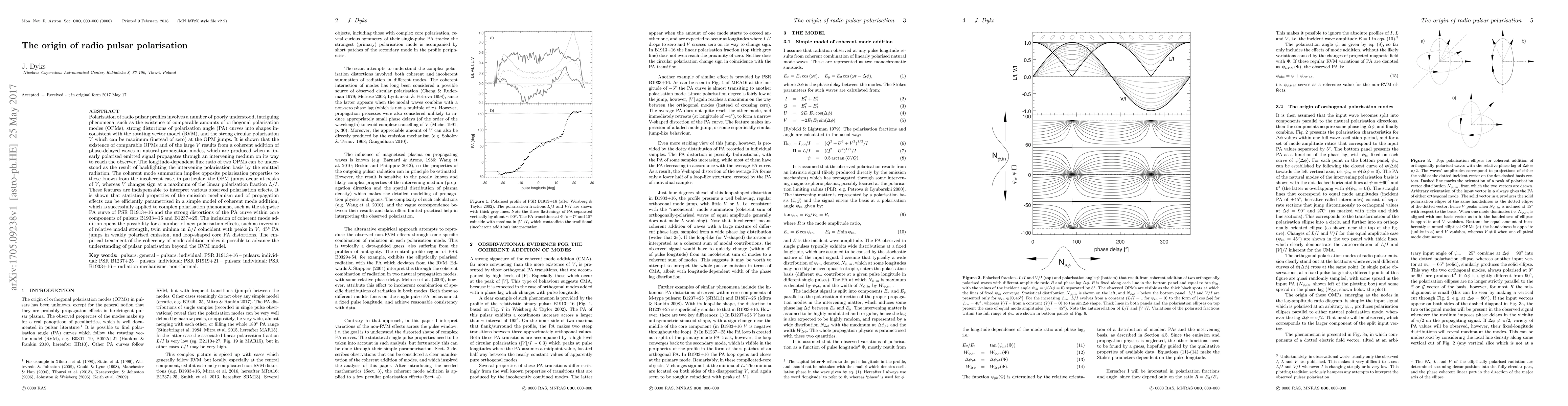 Polarisation of radio pulsar profiles involves a number of poorly understood, intriguing phenomena, such as the existence of comparable amounts of orthogonal polarisation modes (OPMs), strong distortions of polarisation angle (PA) curves into shapes inconsistent with the rotating vector model (RVM), and the strong circular polarisation V which can be maximum (instead of zero) at the OPM jumps. It is shown that the existence of comparable OPMs and of the large V results from a coherent addition of phase-delayed waves in natural propagation modes, which are produced by an incident linearly polarised signal. The coherent mode summation implies opposite polarisation properties to those known from the incoherent case, in particular, the OPM jumps occur at peaks of V , whereas V changes sign at a maximum of the linear polarisation fraction L/I. These features are indispensable to interpret various observed polarisation effects. It is shown that statistical properties of the emission mechanism and of propagation effects can be efficiently parametrised in a simple model of coherent mode addition, which is successfully applied to complex polarisation phenomena, such as the stepwise PA curve of PSR B1913+16 and the strong distortions of the PA curve within core components of pulsars B1933+16 and B1237+25. The inclusion of coherent mode addition opens the possibility for a number of new polarisation effects, such as inversion of relative modal strength, twin minima in L/I coincident with peaks in V , 45 deg PA jumps in weakly polarised emission, and loop-shaped core PA distortions. The empirical treatment of the coherency of mode addition makes it possible to advance the understanding of pulsar polarisation beyond the RVM model.