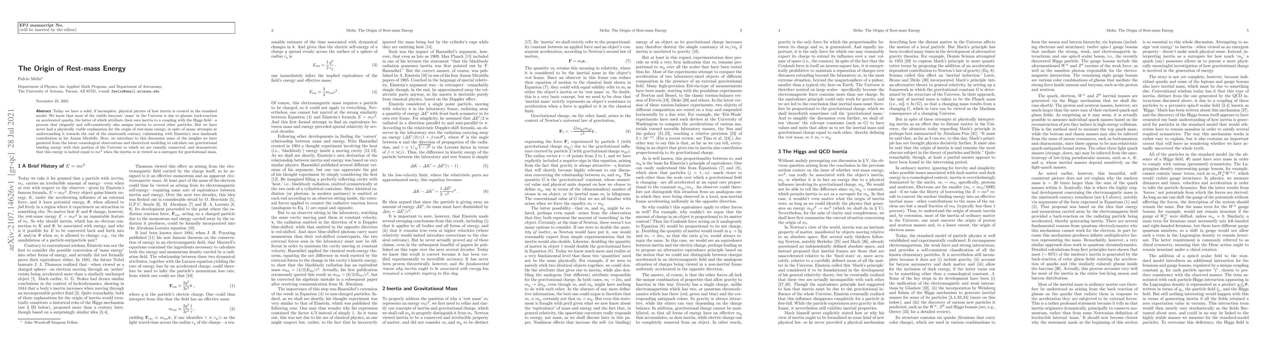 Today we have a solid, if incomplete, physical picture of how inertia is created in the standard model. We know that most of the visible baryonic `mass' in the Universe is due to gluonic back-reaction on accelerated quarks, the latter of which attribute their own inertia to a coupling with the Higgs field -- a process that elegantly and self-consistently also assigns inertia to several other particles. But we have never had a physically viable explanation for the origin of rest-mass energy, in spite of many attempts at understanding it towards the end of the nineteenth century, culminating with Einstein's own landmark contribution in his Annus Mirabilis. Here, we introduce to this discussion some of the insights we have garnered from the latest cosmological observations and theoretical modeling to calculate our gravitational binding energy with that portion of the Universe to which we are causally connected, and demonstrate that this energy is indeed equal to mc^2 when the inertia m is viewed as a surrogate for gravitational mass.