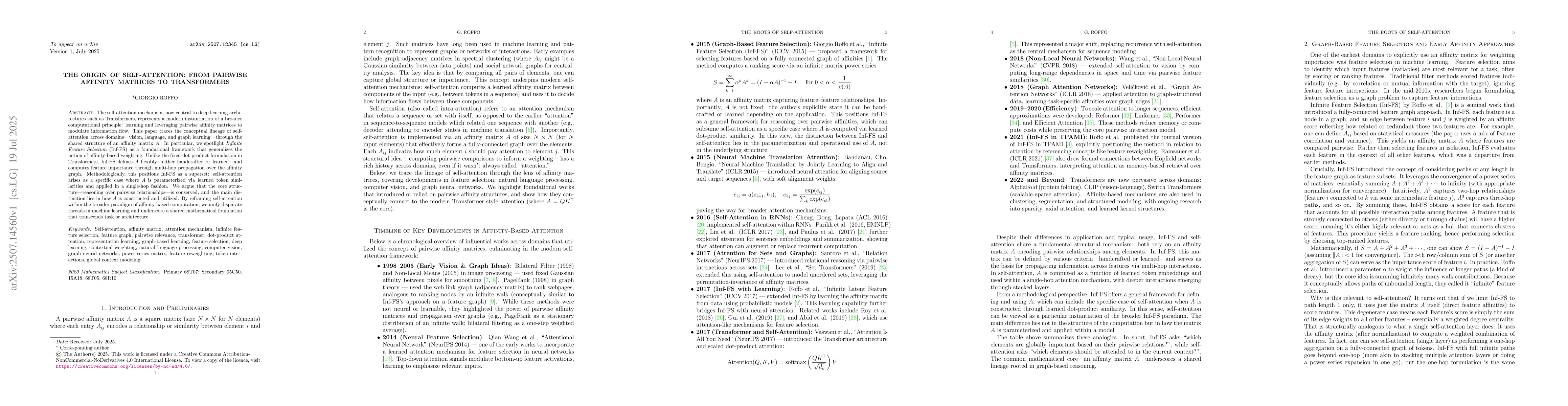 The self-attention mechanism, now central to deep learning architectures such as Transformers, is a modern instance of a more general computational principle: learning and using pairwise affinity matrices to control how information flows through a model. This paper traces the conceptual origins of self-attention across multiple domains, including computer vision, natural language processing, and graph learning, through their shared reliance on an affinity matrix, denoted as A. We highlight Infinite Feature Selection (Inf-FS) as a foundational approach that generalizes the idea of affinity-based weighting. Unlike the fixed dot-product structure used in Transformers, Inf-FS defines A either through domain knowledge or by learning, and computes feature relevance through multi-hop propagation over the affinity graph. From this perspective, self-attention can be seen as a special case of Inf-FS: it uses a single-hop affinity computation where A is dynamically built from token similarities. We argue that the underlying structure, reasoning over pairwise relationships, is preserved across both approaches, and the key differences lie in how the affinity matrix is defined and applied. By situating self-attention within the broader paradigm of affinity-based computation, we unify several strands of machine learning research and highlight a common mathematical foundation that underpins diverse models and tasks.