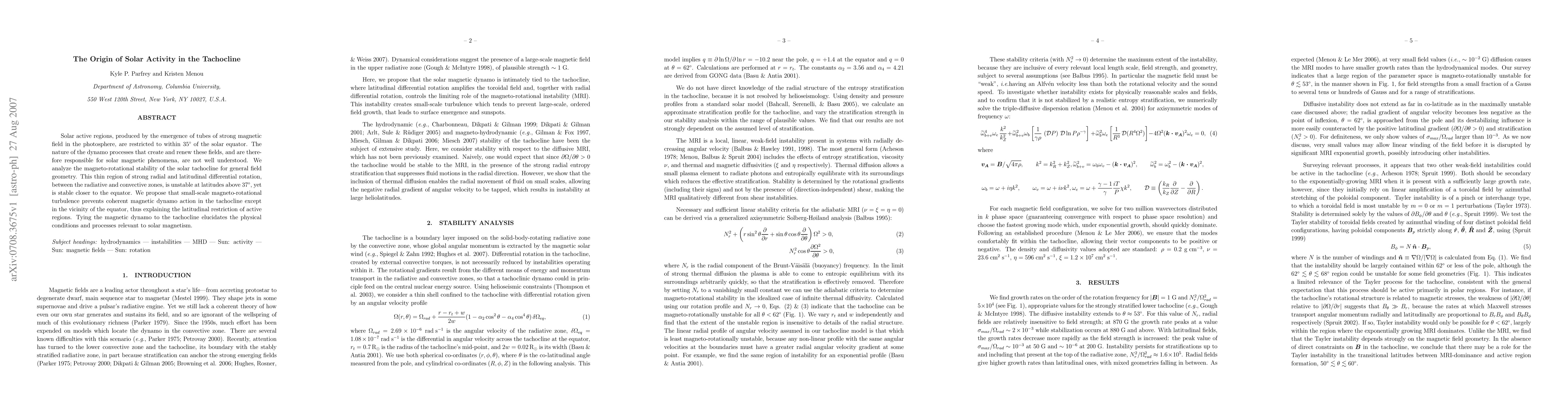 This paper investigates the magneto-rotational stability of the solar tachocline, proposing that turbulence in this region inhibits magnetic dynamo action except near the equator, which explains the latitudinal restriction of solar active regions. The study ties the origin of solar magnetic phenomena to the tachocline, highlighting its role in solar magnetism.