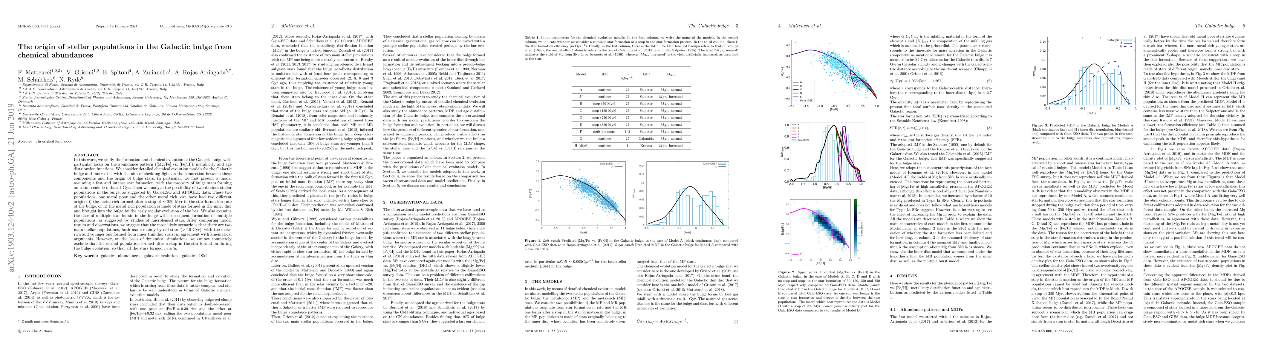 This paper investigates the formation and chemical evolution of the Galactic bulge, proposing two distinct stellar populations: one metal-poor and one metal-rich, likely formed from either inner disc stars or after a star formation hiatus. The study suggests a scenario where both populations are old, with the metal-rich group originating from the inner disc, though in situ formation cannot be entirely ruled out.