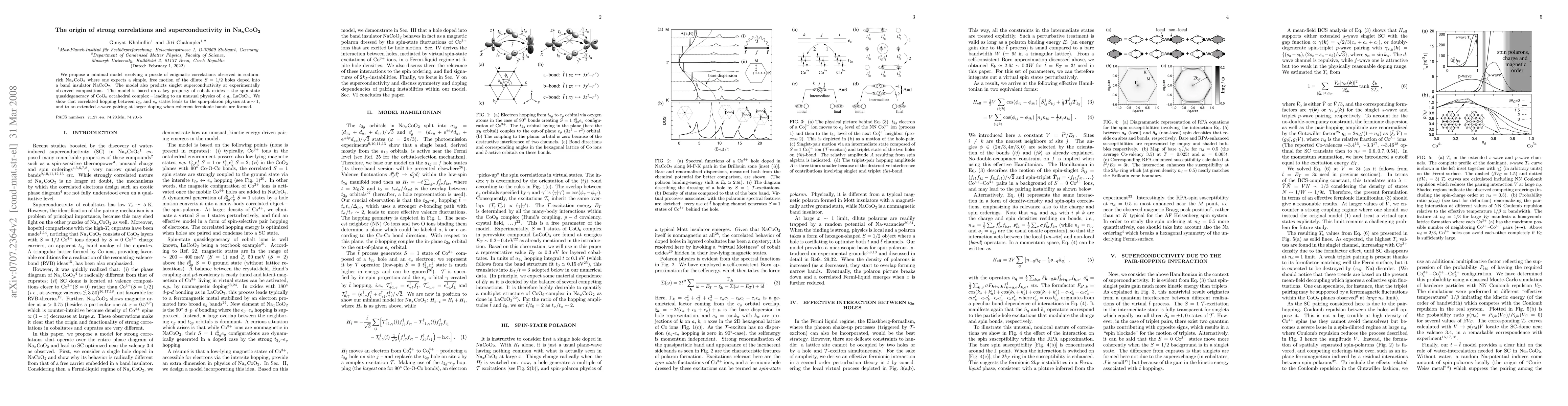 We propose a minimal model resolving a puzzle of enigmatic correlations observed in sodium-rich Na$_x$CoO$_2$ where one expects a simple, free motion of the dilute $S=1/2$ holes doped into a band insulator NaCoO$_2$. The model also predicts singlet superconductivity at experimentally observed compositions. The model is based on a key property of cobalt oxides -- the spin-state quasidegeneracy of CoO$_6$ octahedral complex -- leading to an unusual physics of, {\it e.g.}, LaCoO$_3$. We show that correlated hopping between $t_{2g}$ and $e_g$ states leads to the spin-polaron physics at $x\sim 1$, and to an extended s-wave pairing at larger doping when coherent fermionic bands are formed.