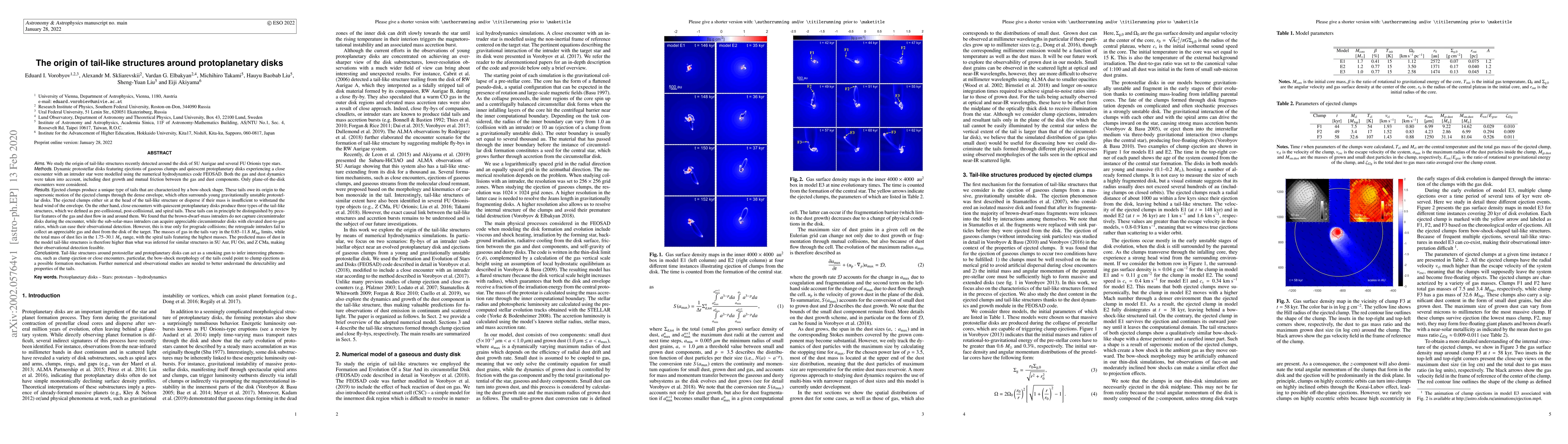 This study uses FEOSAD to model tail-like structures around SU Aurigae and FU Orionis-type stars, attributing them to ejected gas clumps from protostellar disks. These tails, distinguished by bow-shock shapes, result from supersonic motion through dense envelopes. Close encounters with quiescent disks create pre-collisional, post-collisional, and spiral tails. Brown dwarf intruders don't capture disks, but subsolar-mass ones can acquire dust-rich disks, aiding observational detection. The model predicts more dust mass in these tails than observed, suggesting observational discrepancies.
